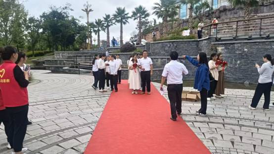 仪式上,10对新人在浪漫的婚礼进行曲中迈着轻盈的步子走向舞台,每个人的脸上都洋溢着幸福快乐的色彩。活动中,由主持人带领新人进行集体结婚宣誓、发放《婚育新风倡议书》、为新人集体颁发《结婚证》、赠发纪念品、公园打卡留念。整个过程充满了仪式感,到场的新人积极响应,现场气氛热烈。简朴的仪式、温馨的活动,让新人们今后的婚姻生活留下浓墨重彩的一笔、留下深刻的记忆。