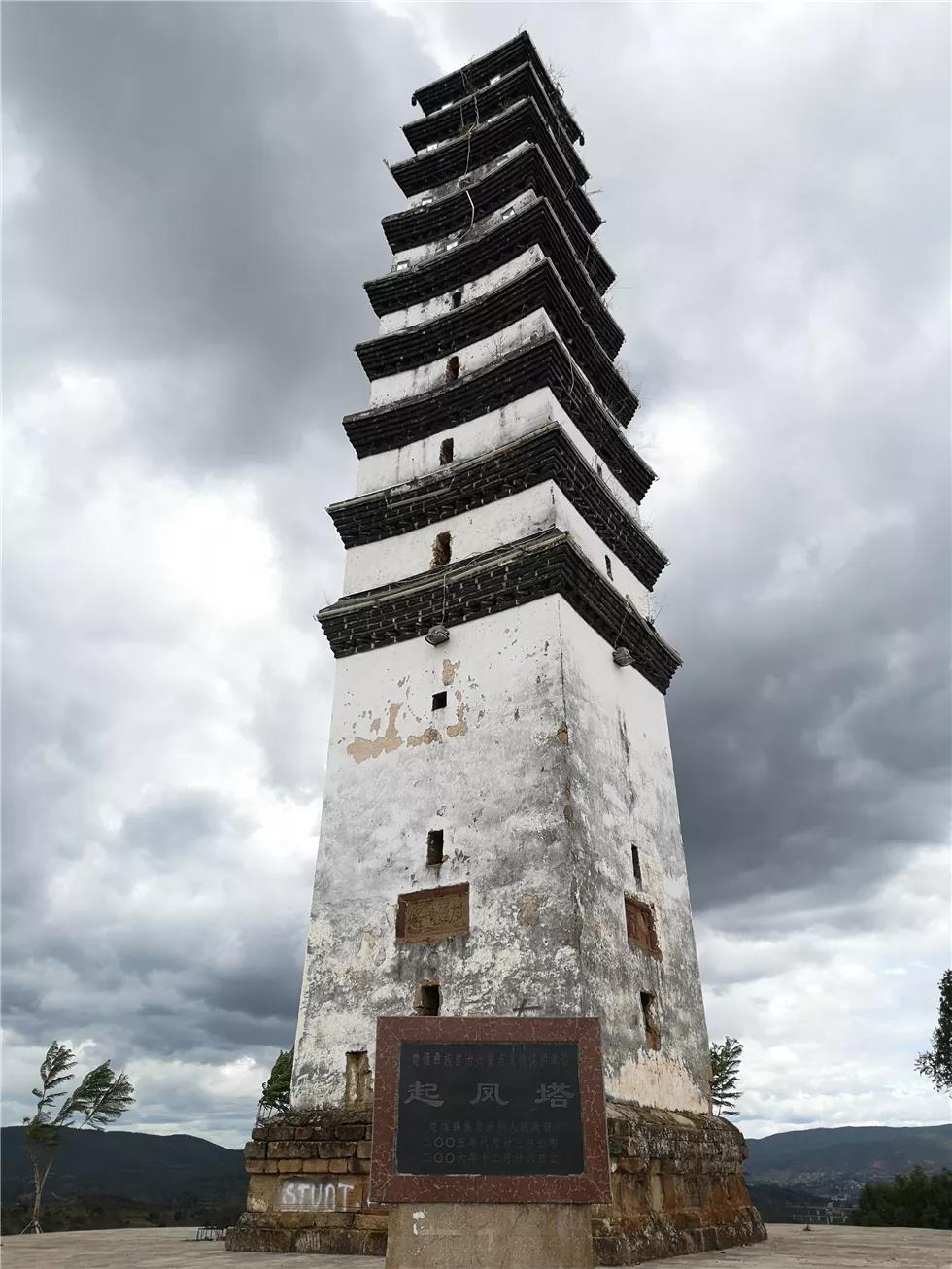 起凤塔位于广通镇政府南方约2公里的文碧山山顶,该塔建于清代乾隆四十八年(1783年),为正方形九级空心砖石结构密檐式宝塔,塔高19米,塔基呈须弥座式样,边长4.3米、高1.39米。第一级为石砌体,高7.27米,其他为青砖塔身,石质宝顶塔刹。