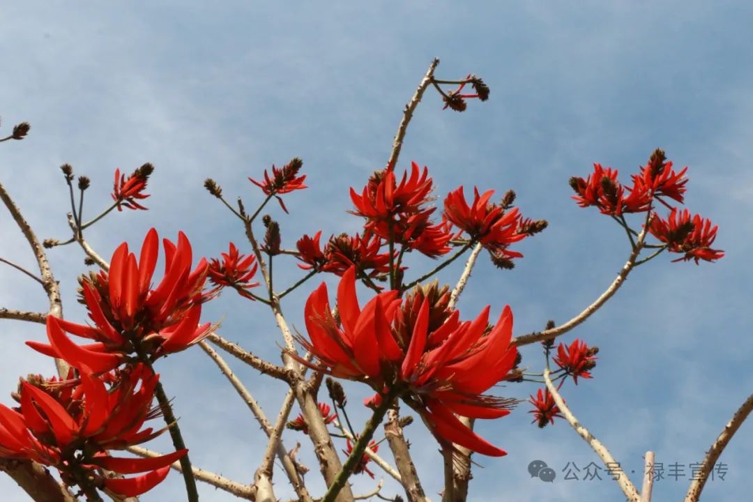 刺桐为早春开花植物,花红似火,为人们捎来春的讯息。刺桐又名“瑞桐”,代表着吉祥如意,树身高大挺拔,枝叶茂盛,生命力顽强,3月前后开花,花色鲜红如火炬,每一个花序就好似一串熟透了的火红的大辣椒。以前的人们没有计时工具时,人们以山上的刺桐花开为一年的开始,因此留下“怀葛山中无岁月,一年又见刺桐花”的诗句。