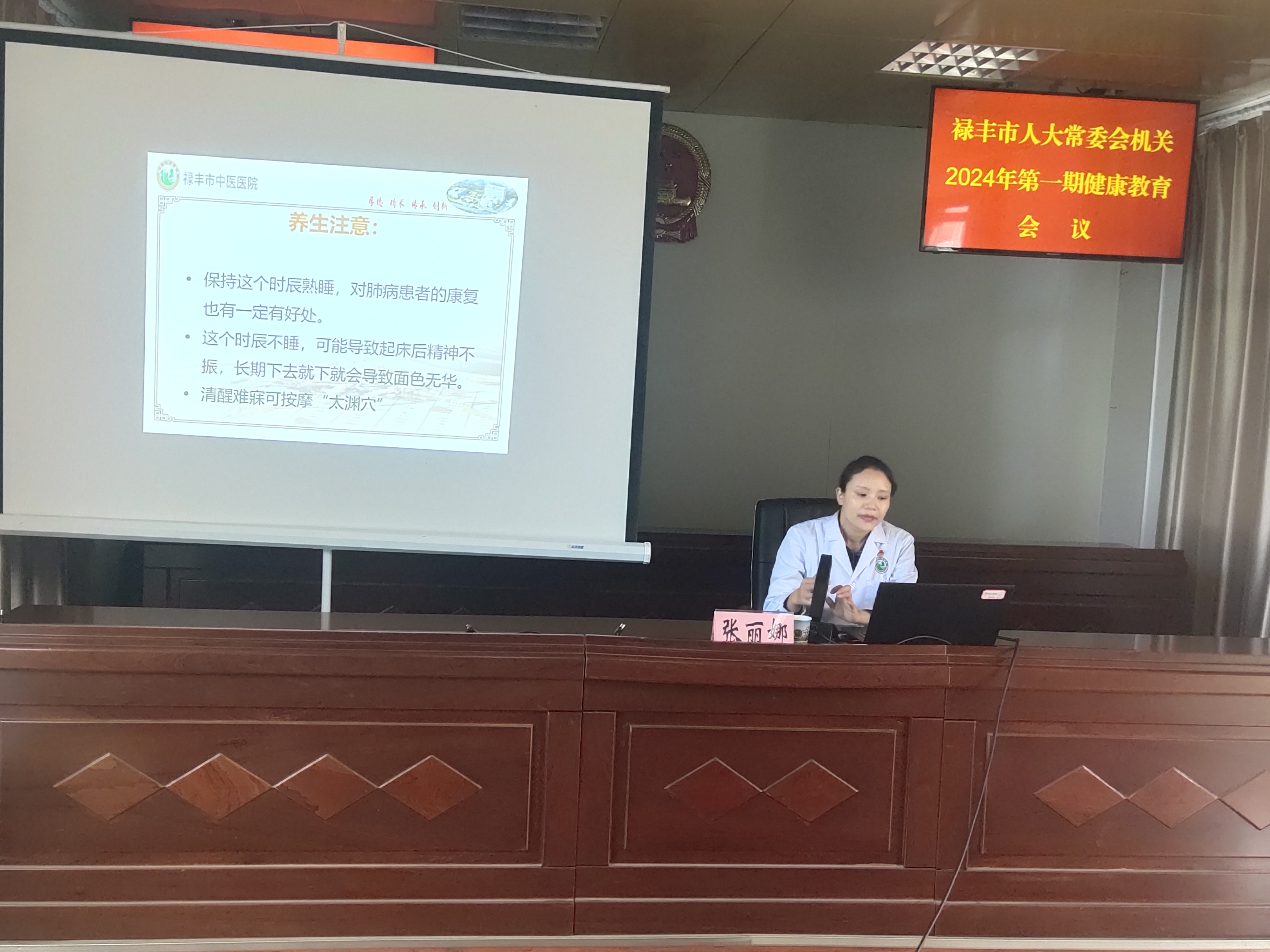 为响应第36个爱国卫生月活动,进一步提升机关干部职工的健康素养,4月17日上午,禄丰市人大常委会机关开展以“中医养生保健治未病”为主题的2024年第一期健康教育讲座,机关全体干部职工30余人参加。