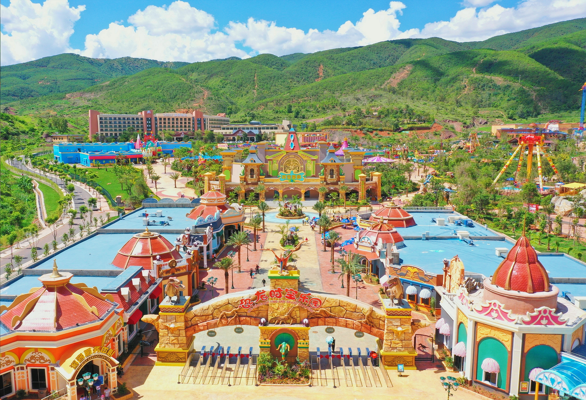 恐龙乐园位于恐龙文化科学展示区北侧,被称为恐龙时空乐园,其占地约330亩,现拥有27个游乐项目点,包含声光电相结合的高科技、沉浸式影院项目;各类游乐设备97台,舞台类项目4场,同时还有行为艺术、变形金刚互动、恐龙巡游、迎宾表演等定期演出。恐龙时空乐园从规划着手就站在世界主题乐园最顶端,为使二期恐龙乐园建成后迅速成为国内主题乐园的标杆,除传统的大型机械类游乐设备外,率先引进世界一流的科技含量高、体验效果强的特种影视体验项目及声光电与全息技术相结合的亦幻亦真的特种互动演出类项目,黑暗乘骑、飞行影院、魔幻剧场、环境4D影院等四大王牌项目作为主打,力求给游客带来最真实、最震撼的体验效果。恐龙乐园区以时间轴规划,紧扣恐龙文化这一核心主题,分三叠纪、侏罗纪、白垩纪及恐龙动漫科幻世界四大主题园区。四个主题园区以恐龙生活时代的时间链为主要轴线,根据主题不同,打造以高仿真机械恐龙和全息技术复原成像的恐龙园区,让游客在体验完高科技游乐项目带来的震撼体验后,重返现实,与“活”的恐龙亲密接触。