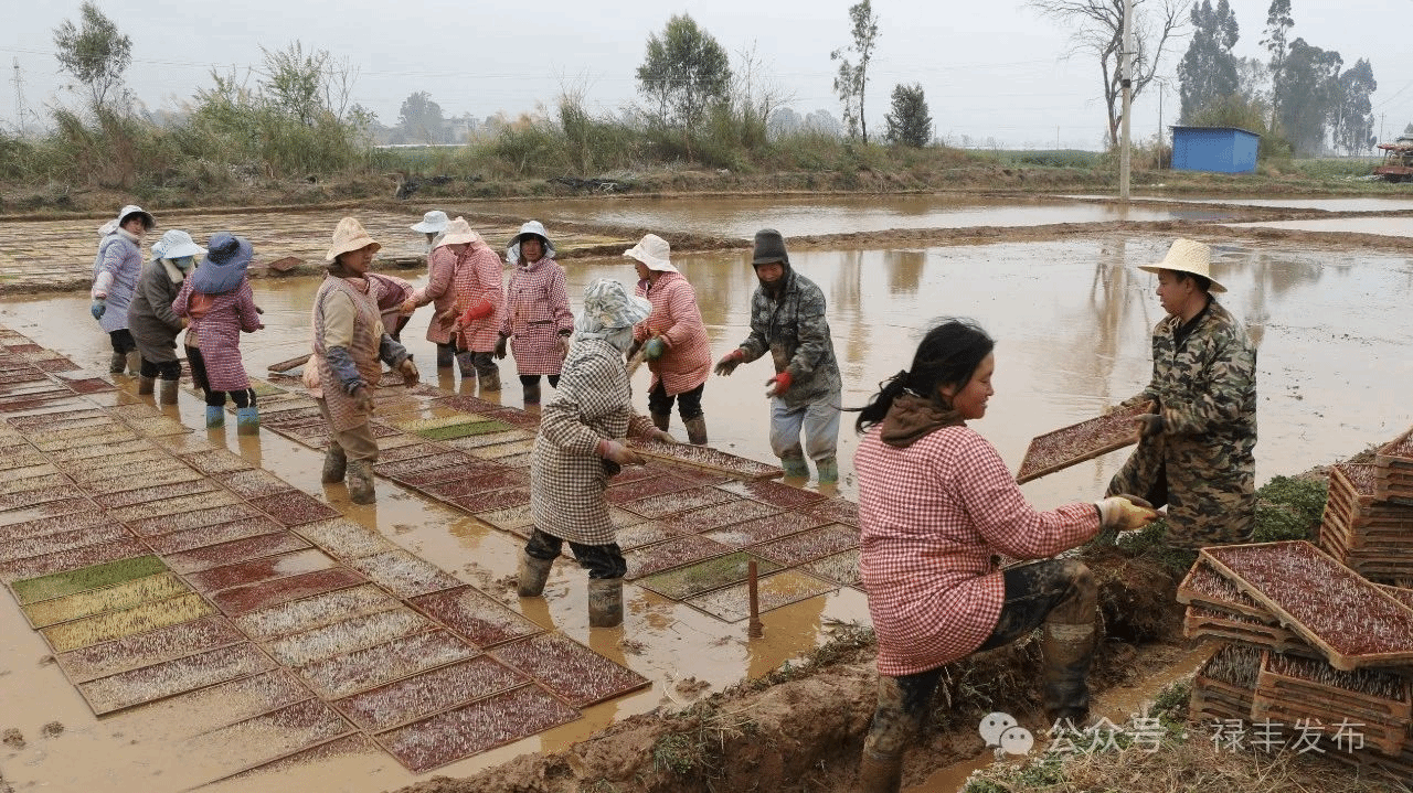 晨雾未散的田野上,此起彼伏的谈笑声与锄头入土的闷响声交织成独特的春耕晨曲。在碧城镇西山村委会大京田村的育秧基地里,邝荣华弯腰将育秧盘轻轻放入水田,手指拂过嫩黄的新芽时,眼角的笑纹里盛满期待。