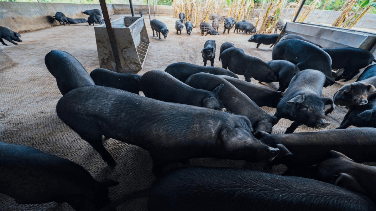 (图为:大中型水库移民后期扶持产业—高原黑猪代养项目)