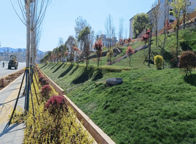 (二)生态治理,变荒坡台地为叠翠景观。原地形以坡地、台地为主,水土流失严重。项目坚持因地制宜,不搞大挖大填,依势造景、顺势铺绿。以乔木为骨架,选用乡土树种构建绿色屏障;以草本为基底,铺设草坪迅速复绿;以花木为亮点,点缀紫薇、玉兰等观花植物;以地方植物为特色,营造“虽由人作、宛自天开”的植被空间。通过“骨架+基底+亮点+特色”四维配置,实现“三季有花、四季常绿、层次分明”的生态效果。