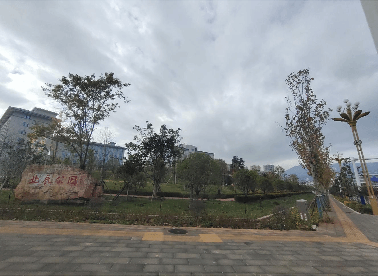 北辰公园位于禄丰市人民政府办公楼北侧,迤西路南侧,东邻金山古镇东路,西邻星宿公园,地处旧城区棚户区改造拆迁范围,占地14124.42平方米,总投资440万元。主要建设内容:栽植乔木360余株、造型灌木118株,铺设混播草坪及地被12000㎡;建设青石板台阶踏步、健康步道、花架、小品置石等配套设施。项目定位为“生态休闲、绿色和谐”的功能复合型场地,与市政府办公区绿地风格协调统一,打造出“绿色、安静、庄严”的整体风貌。