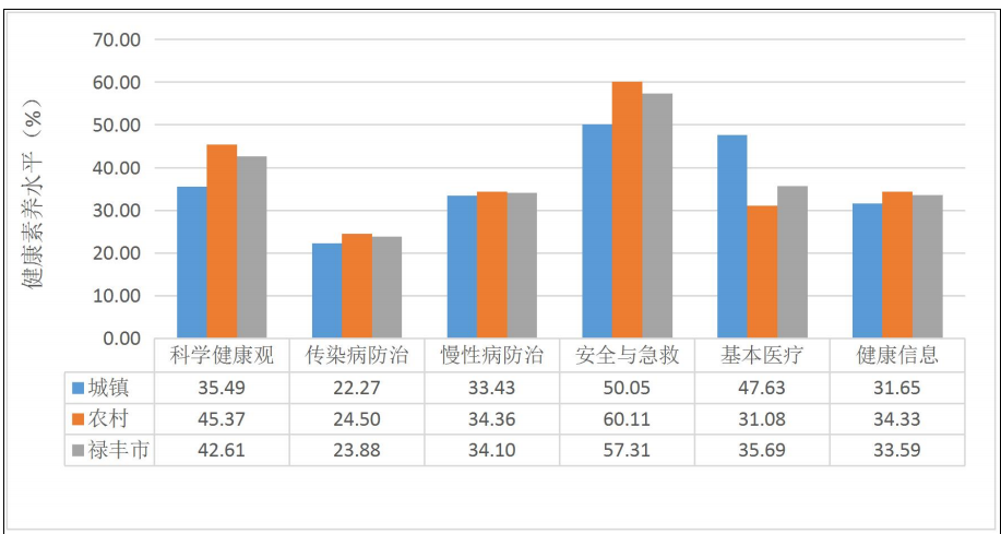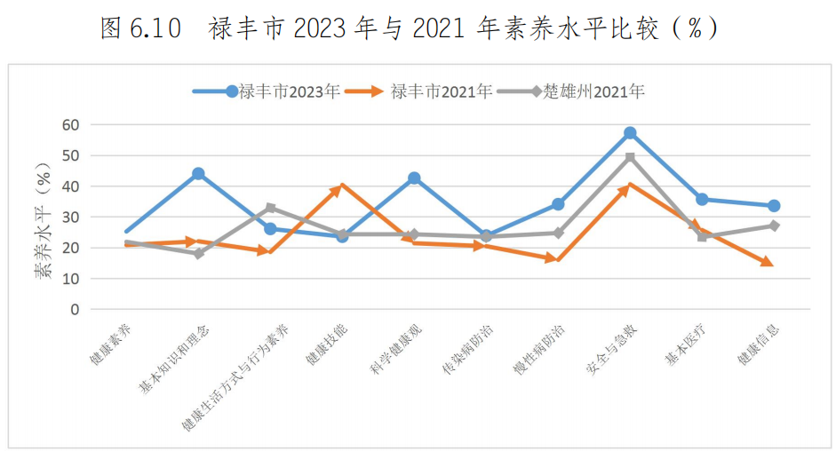 2023年居民健康素养调查显示,健康素养水平总体呈现稳步提升趋势,基本健康知识与理念、慢性病防治素养大幅度提升,科学健康观、传染病防治、慢性病防治、安全与急救、基本医疗、健康信息等6类健康问题与2021年相比有不同程度提升,体现出我市在健康禄丰行动、居民健康素养提升行动、个体化健康教育、健康支持性环境建设等方面已经取得成效,城乡居民健康服务水平不断提升,健康教育与健康促进工作稳步发展,健康、文明的生活方式逐步形成。