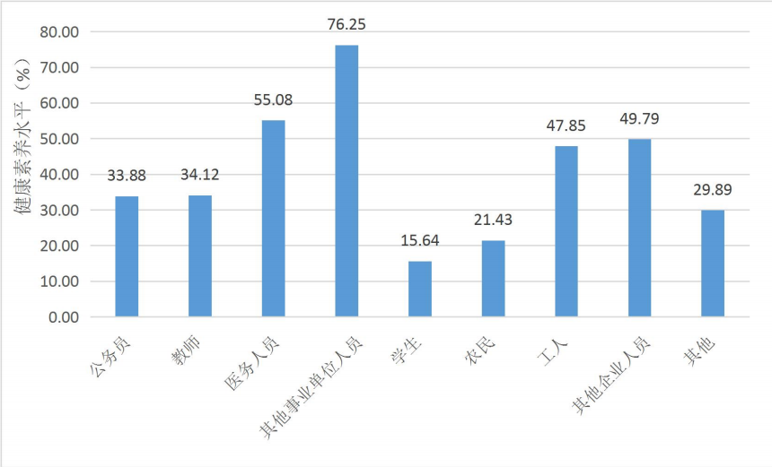 25-34岁组居民健康素养水平最高,达到(38.48%),其次是35-44岁组和15-24岁组,分别为24.48%和23.67%,65-39岁组最低,仅到11.49%。从职业分布上看,医务人员、其它事业单位人员健康素养水平最高,分别达到55.08%和76.25%,学生最低,仅达15.64%。