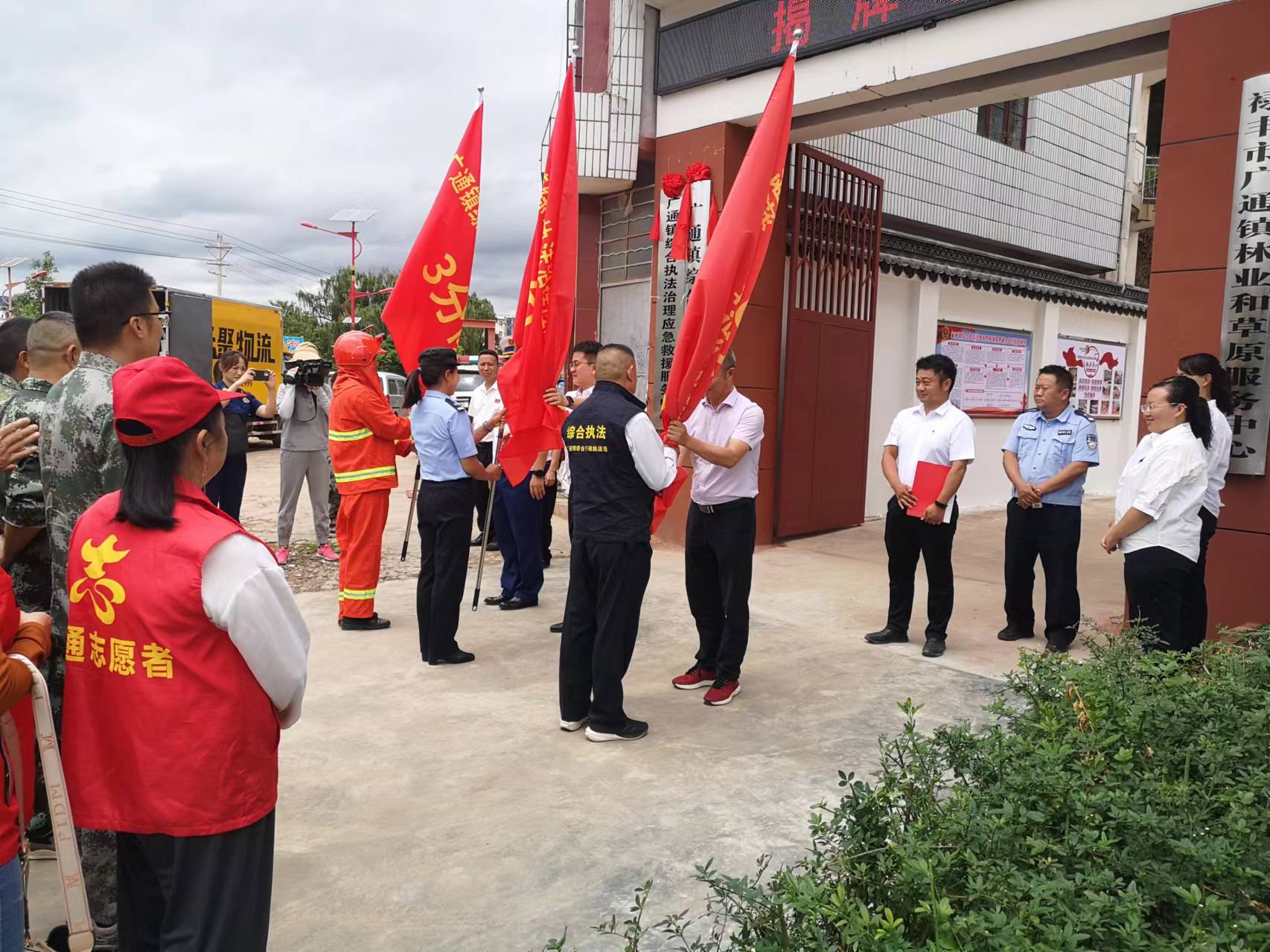 禄丰市消防救援大队大队长杨小龙、禄丰市应急管理局局长李正刚为“广通镇综合执法治理应急救援服务中心”、“广通镇综合应急救援队”揭牌并授旗。