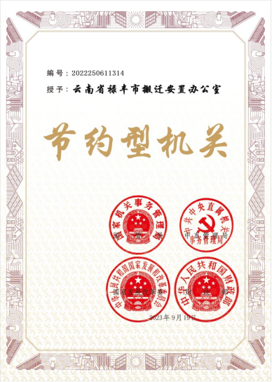 近日,禄丰市搬迁安置办公室被国家机关事务管理局、中共中央直属机关事务管理局、国家发展和改革委员会、财政部联合授予“节约型机关”荣誉称号。