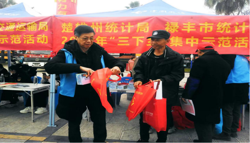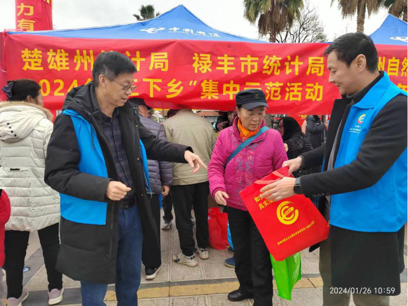 1月26日,楚雄州统计局和禄丰市统计局以楚雄州2024年文化科技卫生“三下乡”集中示范活动为契机,州市两级联动开展了《中华人民共和国统计法》和第五次全国经济普查集中宣传活动。