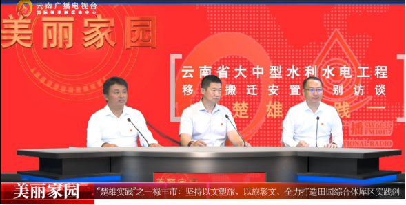 2024年7月22日中午12:00-13:00,在禄丰市搬迁安置办的精心准备和组织下,和平镇党委副书记、镇人民政府镇长郭星伟,和平镇大厂村党总支书记、村委会主任徐正宏,云南禄和智生牧业有限公司董事长郭树发,3人走进了云南广播电视台国际频率融媒体中心演播厅接受了“美丽家园·奋写新篇”大中型水利水电移民搬迁安置“楚雄实践”之-禄丰市的专题访谈,向国际、全国展示了禄丰市在移民后期扶持政策落地实施方面的优秀成果和搬迁安置工作取得的优异成绩,展现了禄丰市在库区和移民安置区建设宜居“美丽家园·移民新村”的美丽画卷,以及发展产业项目带领群众增收致富,有效助力经济社会发展和乡村振兴战略的实施,同时也展现了和平镇坚持以文塑旅、以旅彰文,全力打造田园综合体的库区实践创新基地成功实践。