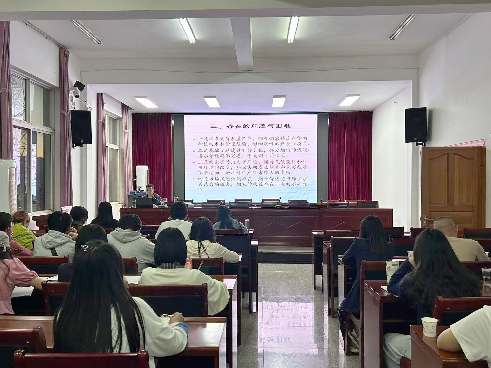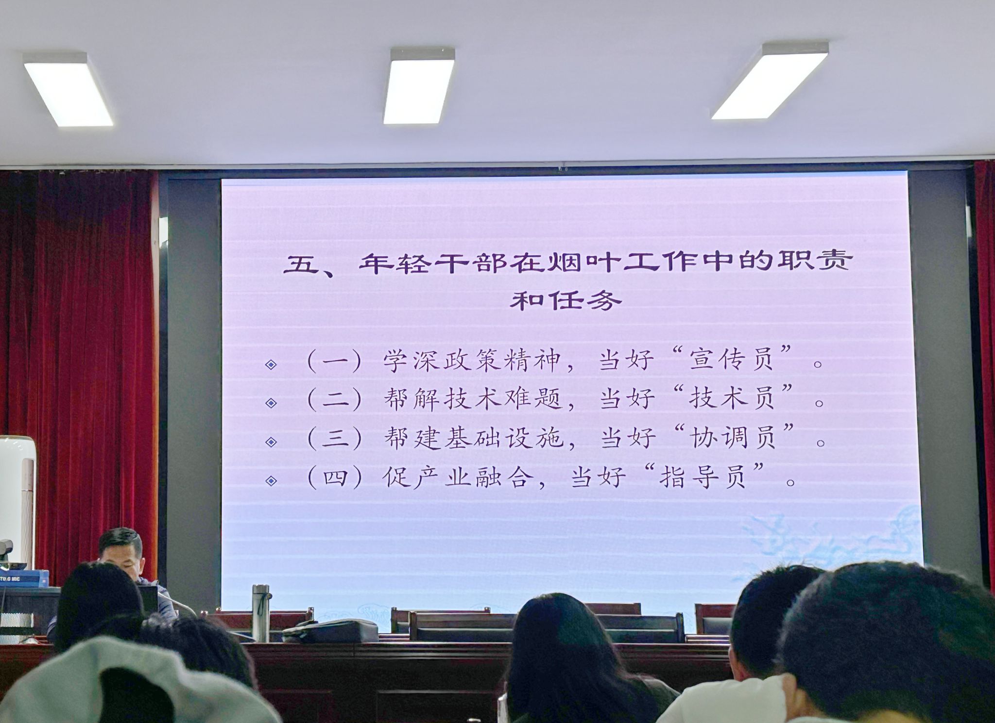 授课中,镇人大主席先阐述辅导背景与目的:烟叶是仁兴镇传统优势产业,是乡村振兴“金色支柱”,但面临市场竞争加剧等挑战。青年干部作为产业创新生力军,需了解产业现状、掌握工作要点,这是履职必修课。课件图文并茂展示烟叶工作基本情况,点出四大难题:烟农素质参差、基础设施有短板、病虫害威胁大、市场风险影响收益,让青年干部清晰认知产业现状。主讲人还讲解了烟叶工作九大要点,涵盖烟区规划、品种种植到成熟采烤、病虫防治全链条,内容贴合实际,为干部提供工作指引。