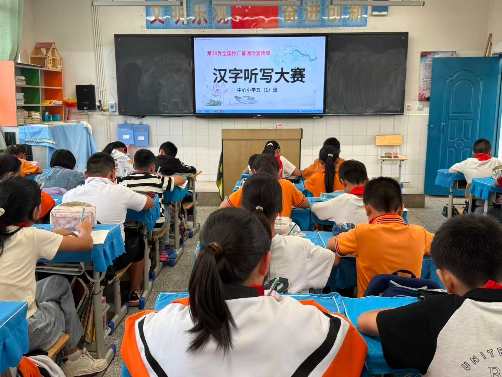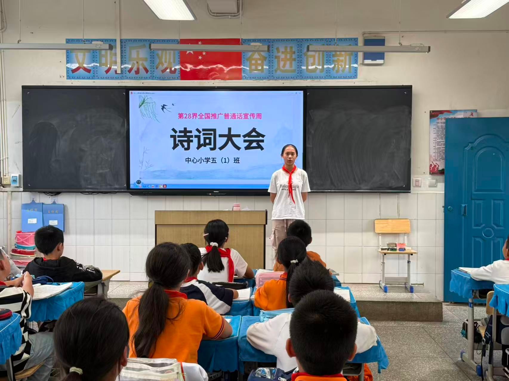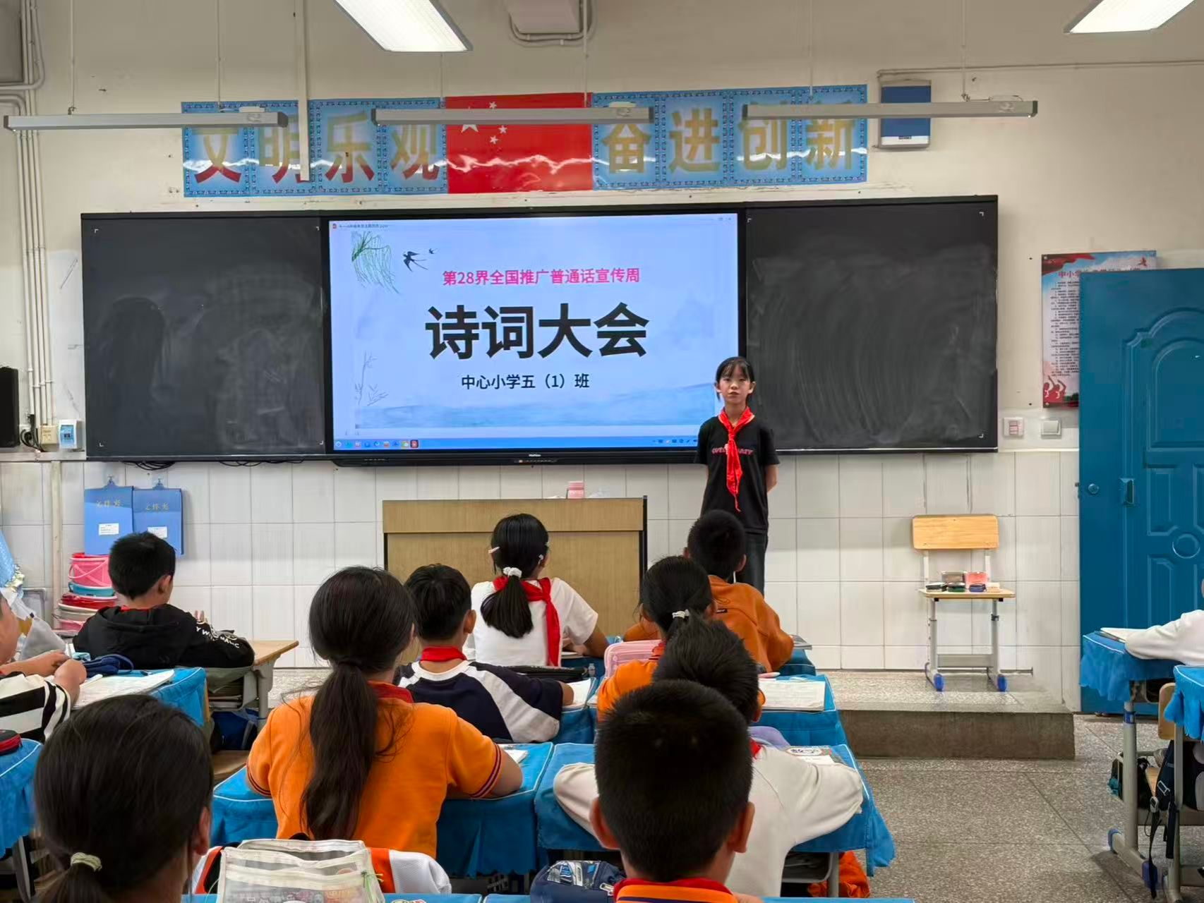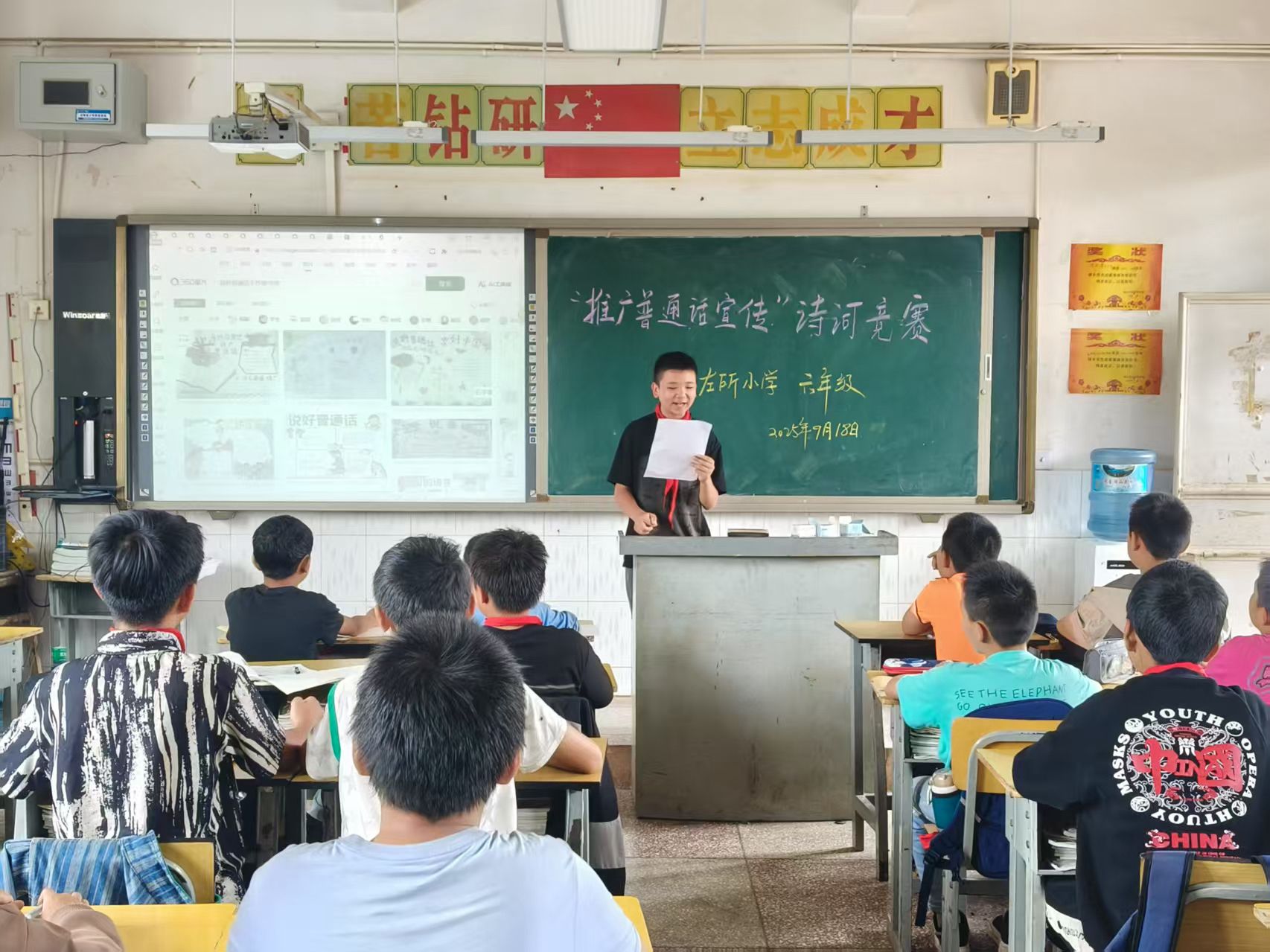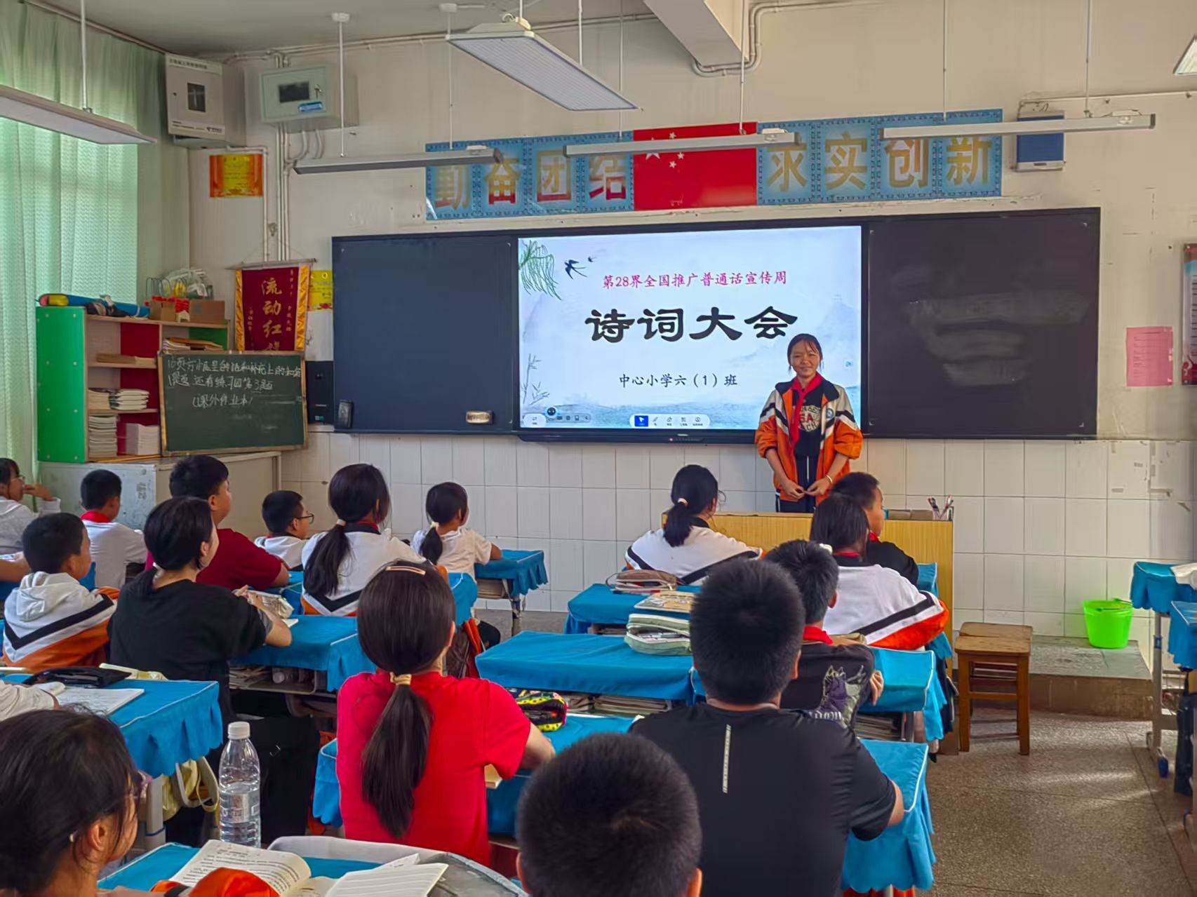 各班级同步开展形式多样的主题班会:低年级以“汉字听写大赛”以赛促学,孩子们在横竖撇捺间感受汉字之美;高年级以“诗词大会”以诗会友,少年们在经典诵读中领略中华文化的博大精深。此外,班会还通过知识竞赛检验普通话常识、鼓励学生分享说普通话的趣事与难题、播放语言文化纪录片讲解方言多样性,绕口令、词语接龙等趣味游戏更让大家在欢笑中提升普通话水平。“以前说普通话总怕说错,今天和同学一起练绕口令,发现原来这么有趣!”“听了纪录片才知道,全国有这么多方言,学好普通话,就能和各地小伙伴畅快聊天啦!”学生们的真切感悟,让推普理念更深入人心。