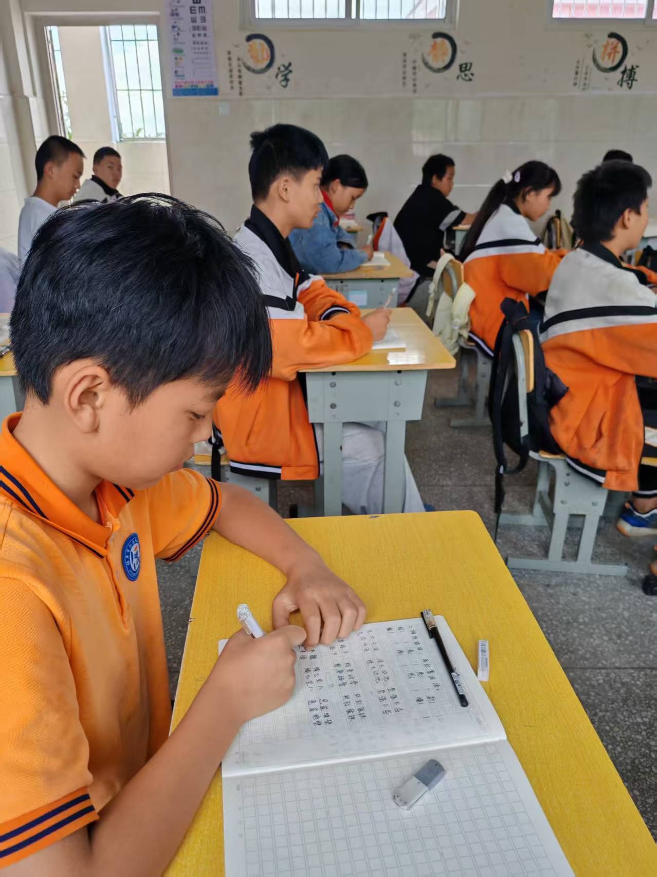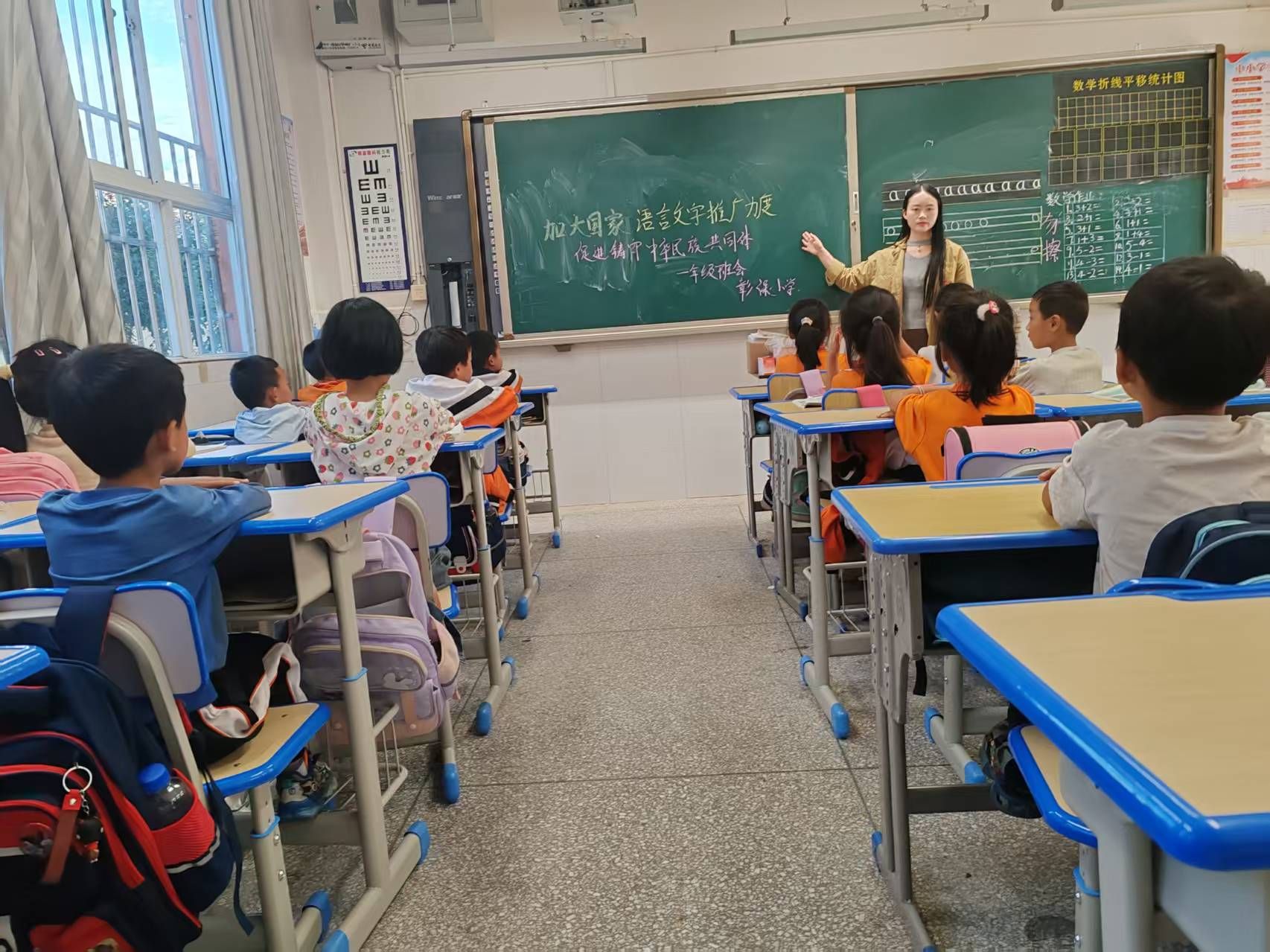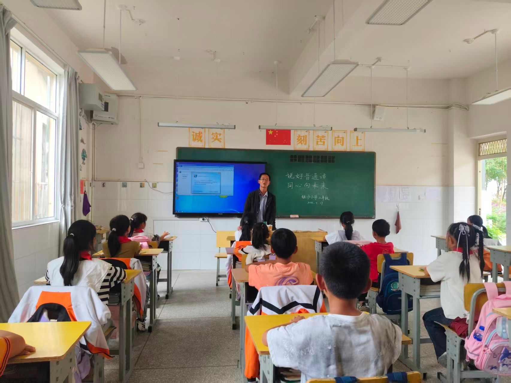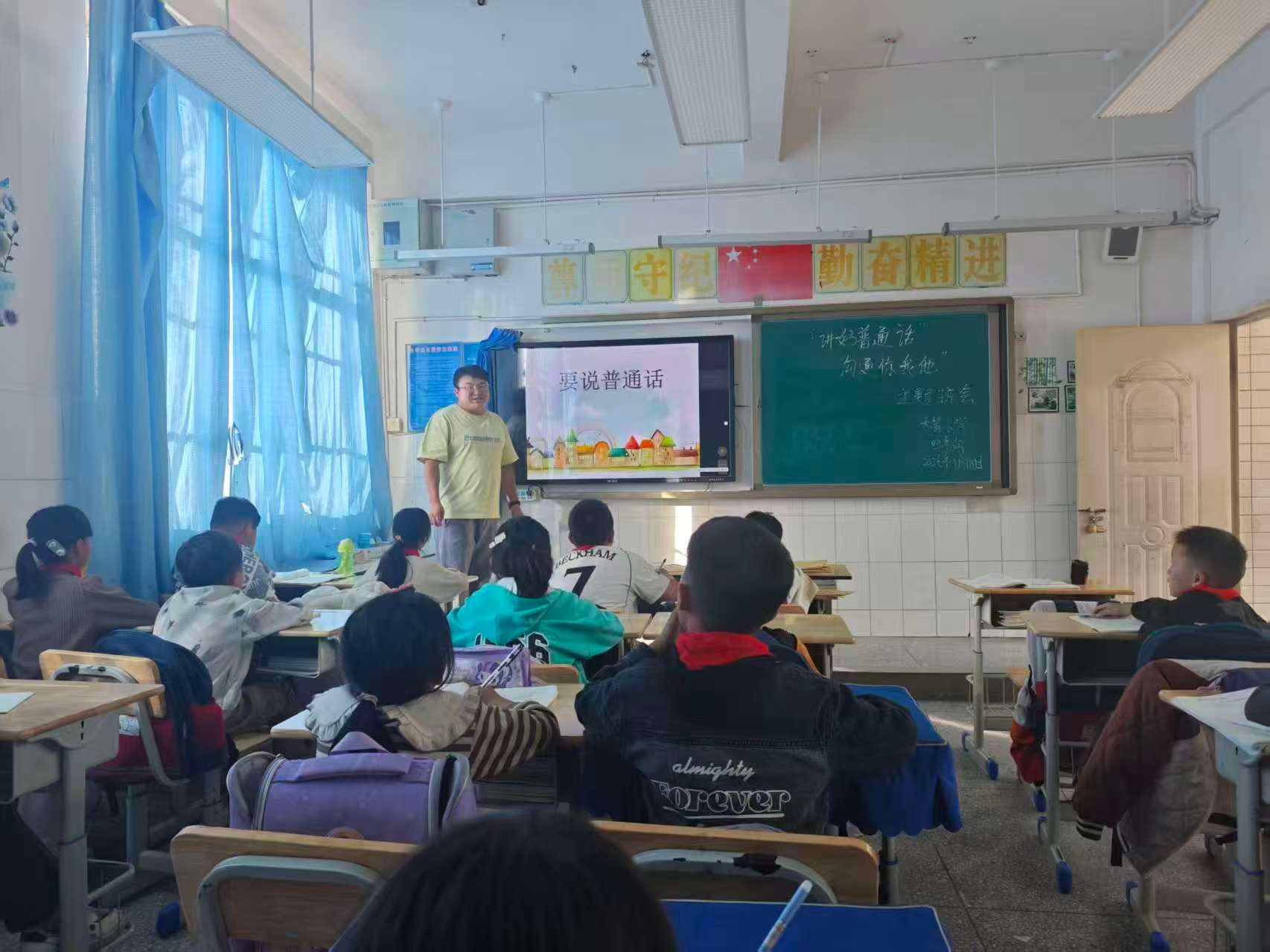 校园内,教学楼、走廊、教室处处可见“说好普通话,迈进新时代”“一字一句普通话,千言万语汇中华”等主题标语;电子屏循环播放“第28届推普周——说普通话、写规范字”“加大国家通用语言文字推广力度,促进铸牢中华民族共同体意识”等宣传语,让推普理念潜移默化、深入人心。