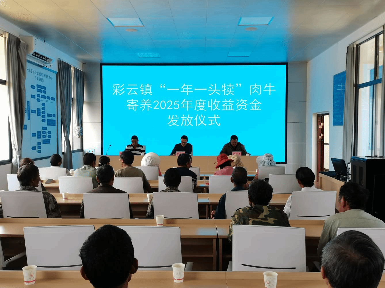 秋意渐浓,佳节将至。在国庆中秋双节前夕,彩云镇的脱贫户们迎来了一份实实在在的“节日大礼”。2025年9月28日下午,彩云镇举行肉牛产业发展利益联结贫困人口“一年一头犊”收益资金发放仪式,参与寄养的脱贫户、企业负责人、镇相关站所负责人参加发放仪式。