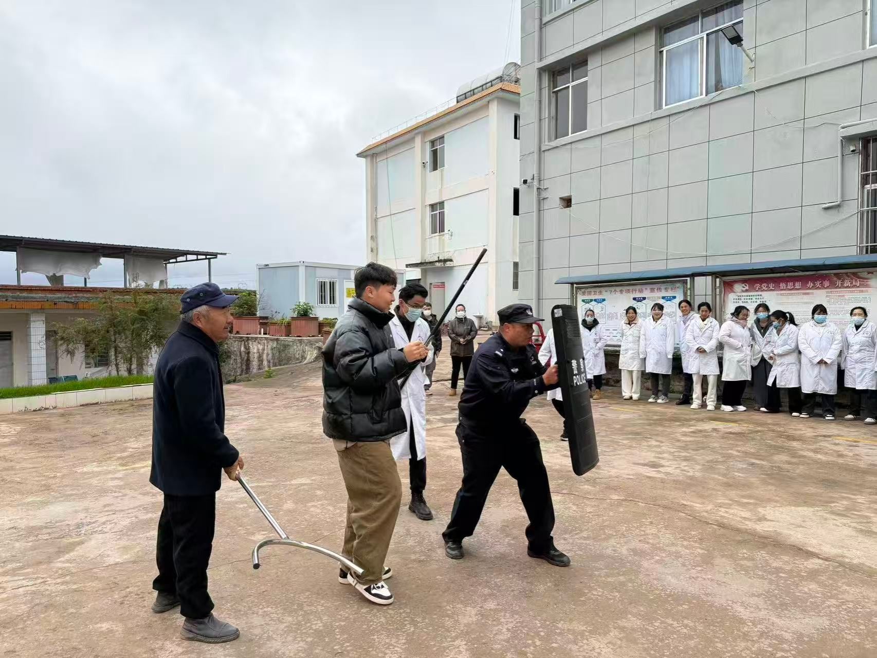 活动开始,高峰乡人民政府副乡长、高峰派出所所长杨林同志耐心又专业地为职工讲解防暴器材(防暴盾、防暴棍、钢叉等)正确使用方法、突发暴力事件的预警识别及自我防护技巧,确保每一位职工都清楚演练流程和关键动作。
