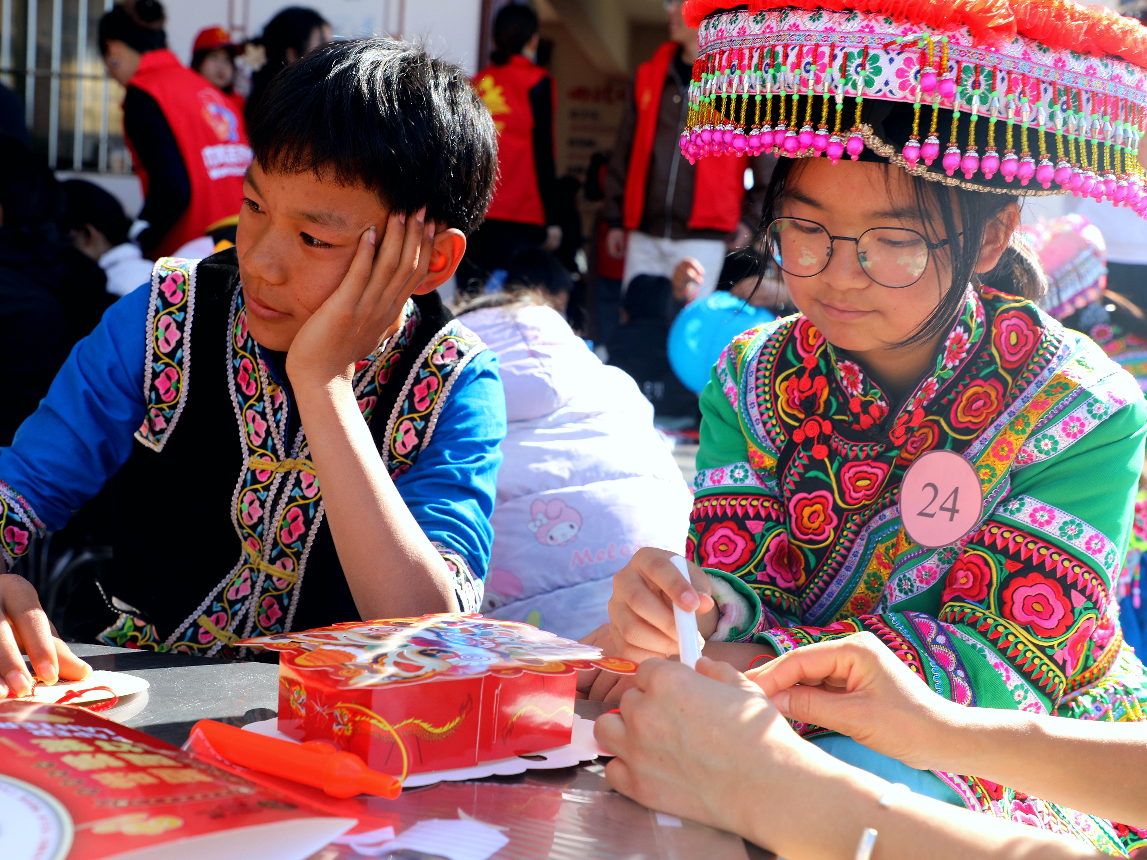 “新春送暖•亲情升温”作为压轴环节,将活动推向高潮。全体人员齐唱《新年好》,共同分享象征团圆与甜蜜的“新春蛋糕”,定格了冬日的温暖。市群团联盟与中村乡妇联为30名儿童送上了满载关爱的新春大礼包。现场还邀请了禄丰市书法家协会与本地书法爱好者挥毫泼墨,书写春联和“福”字,红纸墨香间洋溢着浓浓的年味与真挚的祝福。