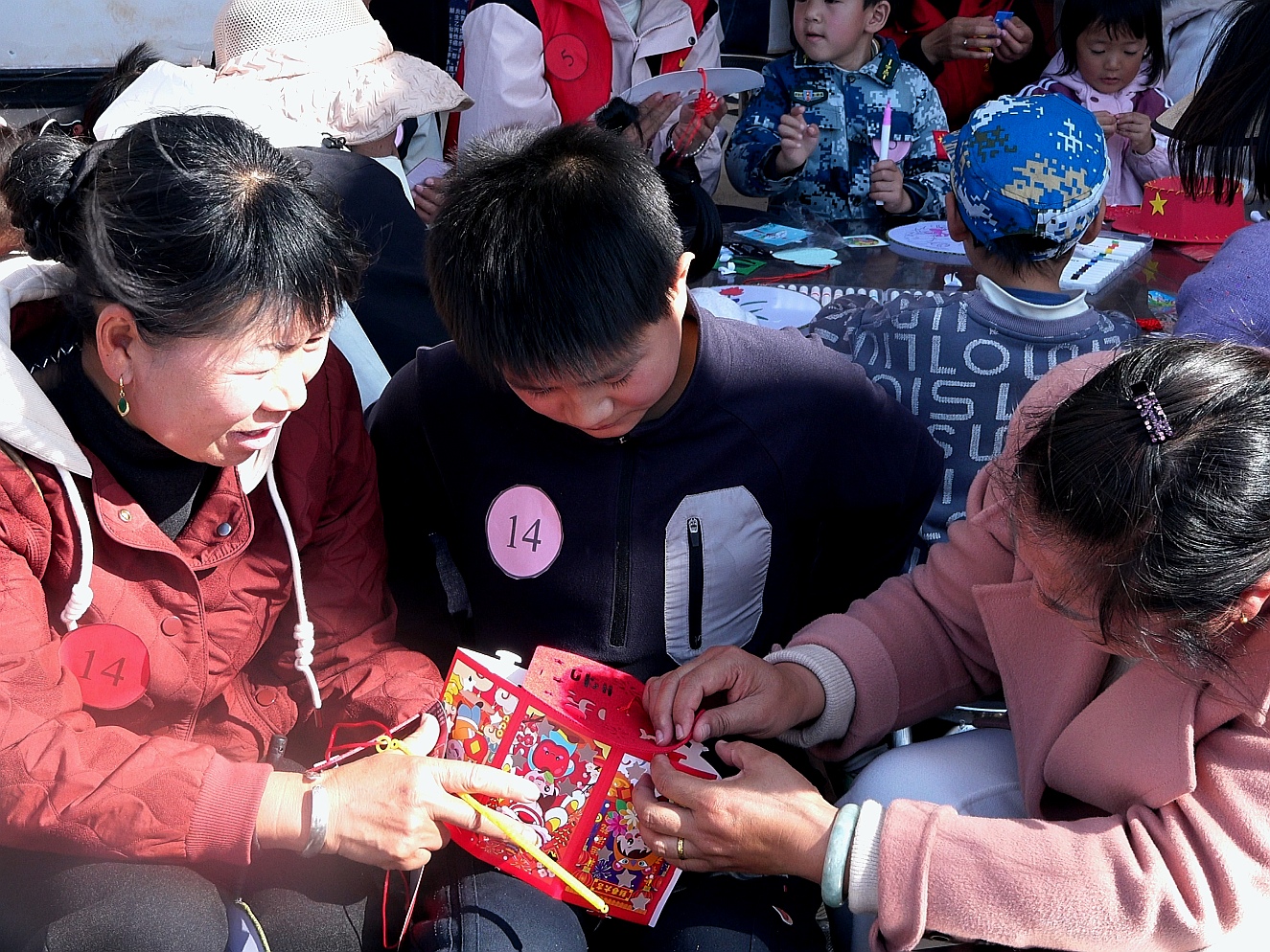科技体验之后,“家风传承•巧手寄情”环节则带来了一份宁静的温情。孩子们在“爱心妈妈”的陪伴帮助下,领取材料包,专注绘制家风家训卡片、新春贺卡,折扇、帽子、灯笼......一件件手工作品上承载着孩子们的祝福与想象,传递着优良家风和对美好生活的向往。