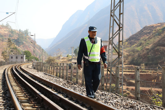 头戴安全帽,身穿工作服,斜挎工具包,一个手电,一把小铁锤是他每天工作时的装备。28年来,他日夜巡视,守护着成昆线甸心工区所管辖的899公里至903公里处的线路安全。