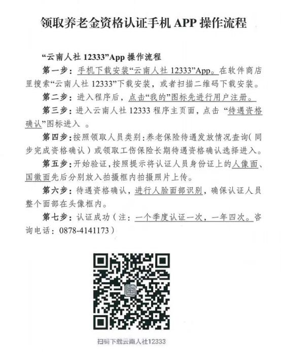 根据《云南省人力资源和社会保障厅关于印发〈云南省领取社会保险待遇资格确认经办规程(试行)的通知》(云人社通〔2019〕112号)要求,退休人员领取养老金需首先进行资格认证,方可按时发放养老金,请您按要求积极开展资格认证。