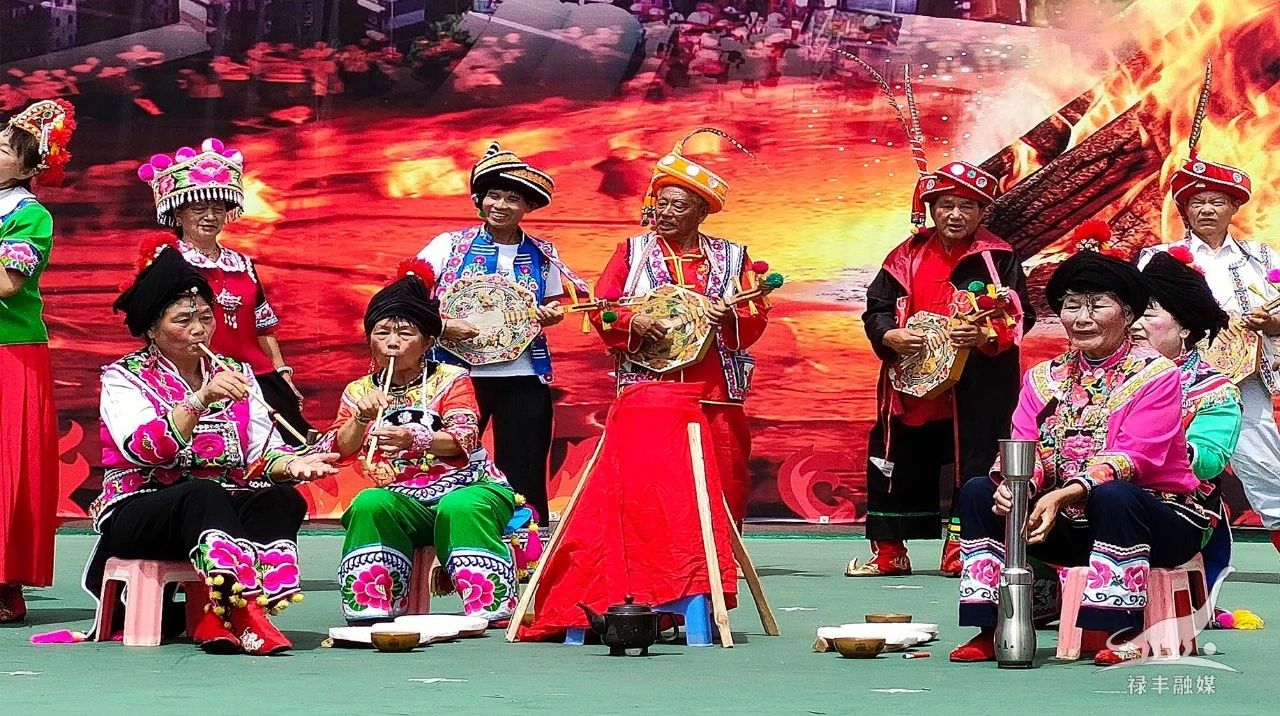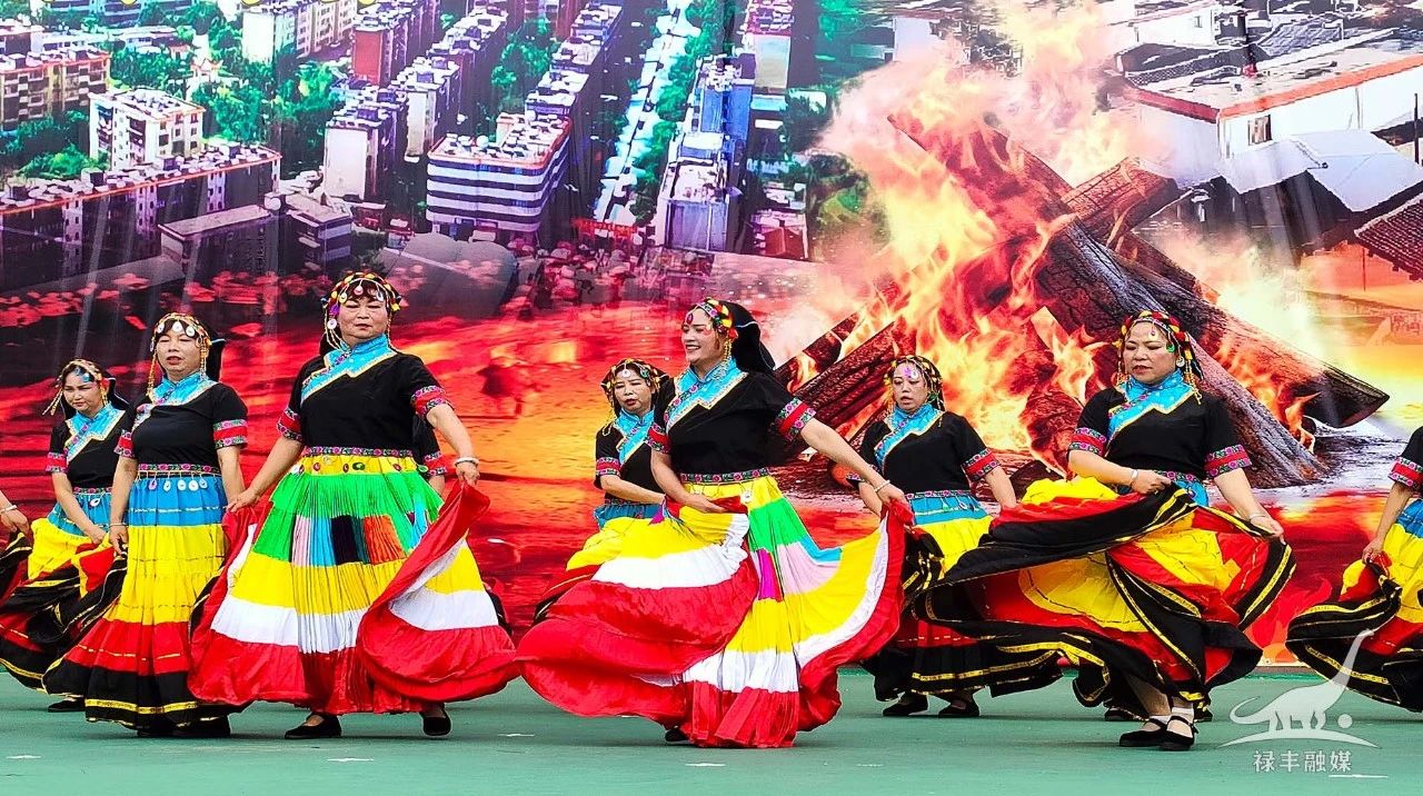 白天,在一平浪镇干海资社区,当地各族群众与盐矿、煤矿群众欢聚一堂,热热闹闹过大节。当地农村文艺队表演的《盛世舞龙》、非遗节目《新跳酒》以及《火塘谣》、《火把欢歌》等歌舞,渲染了火把节热闹、欢腾的节日氛围,也把火把节祝福以歌舞的形式呈现给观众。台下,一边欣赏歌舞、一边品尝美食的观众完全沉浸在节日欢乐的氛围中。
