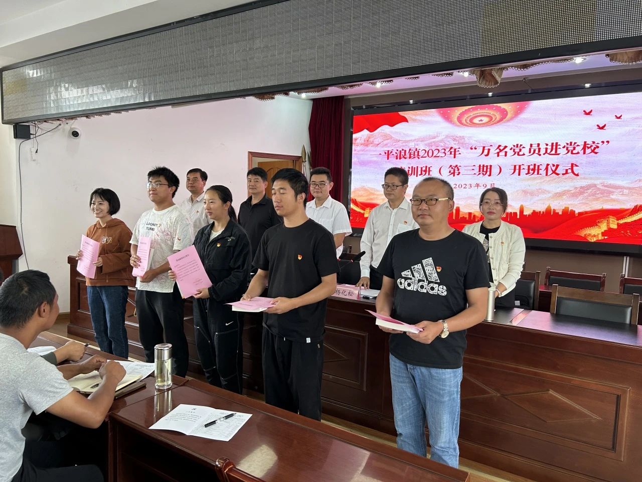 9月26日上午,一平浪镇举办了2023年学习宣传贯彻党的二十大精神专题培训班暨“万名党员进党校”培训班(第三期)开班仪式,机关和农村400余名党员在镇党校主会场和村级分会场参加。开班仪式上,全体参训党员重温了入党誓词、齐唱红歌《没有共产党就没有新中国》,为5名党员代表过了政治生日,镇党委副书记、镇人民政府镇长钱小冉作了开班动员。