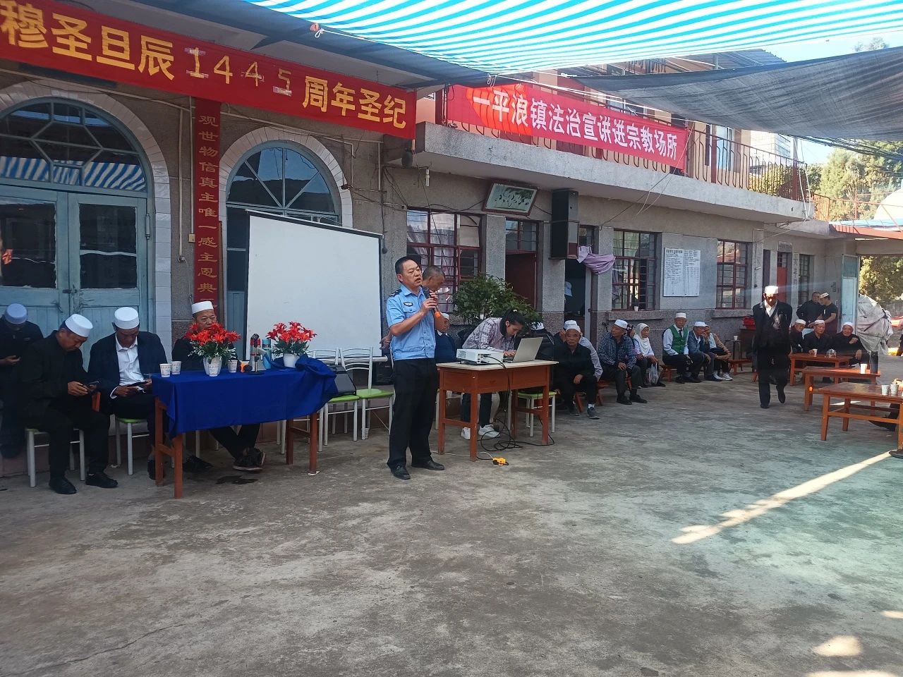 近日,一平浪镇为深入贯彻落实普法强基补短板专项工作要求,不断加强普法宣传主渠道、主阵地建设,将普法触角延伸到宗教场所,以干海资清真寺举办活动为契机,组织派出所、司法所、综治办开展“法治宣讲进宗教场所”活动。