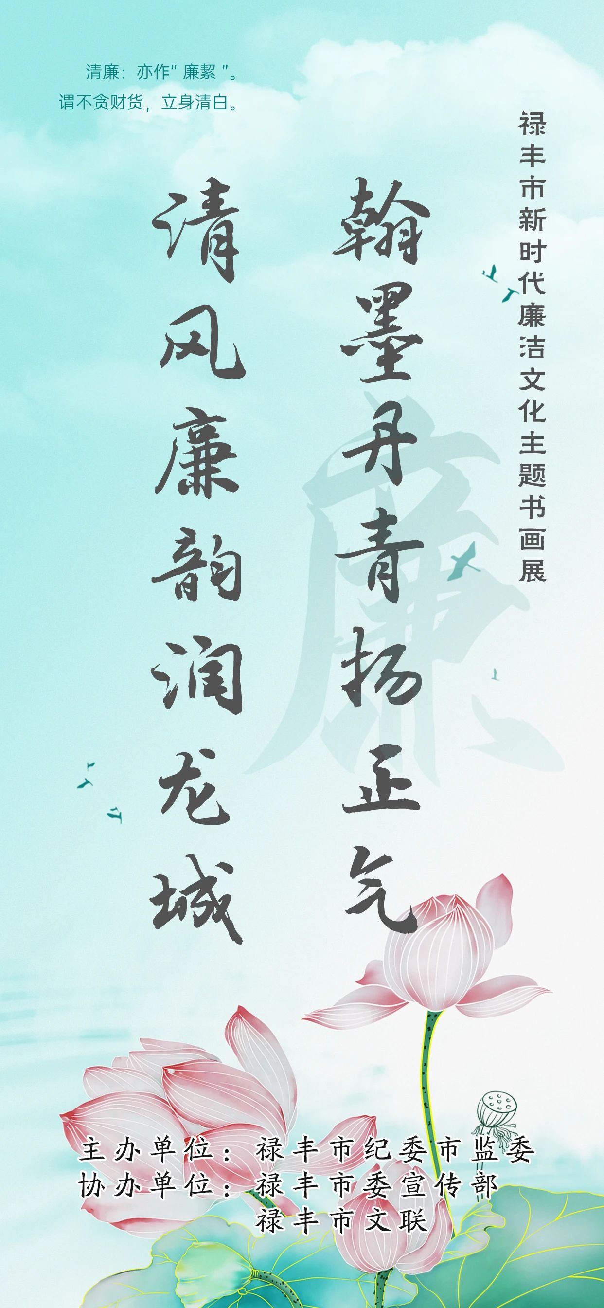 为贯彻落实党中央关于加强新时代廉洁文化建设的部署要求,推动新时代廉洁文化“强基行动”提质增效,在全社会弘扬以清为美、以廉为荣的社会风尚,推动高水平建设“清廉禄丰”,由禄丰市纪委市监委主办,禄丰市委宣传部、禄丰市文联协办,共同推出了《翰墨丹青扬正气 清风廉韵润龙城》禄丰市新时代廉洁文化主题书画展。