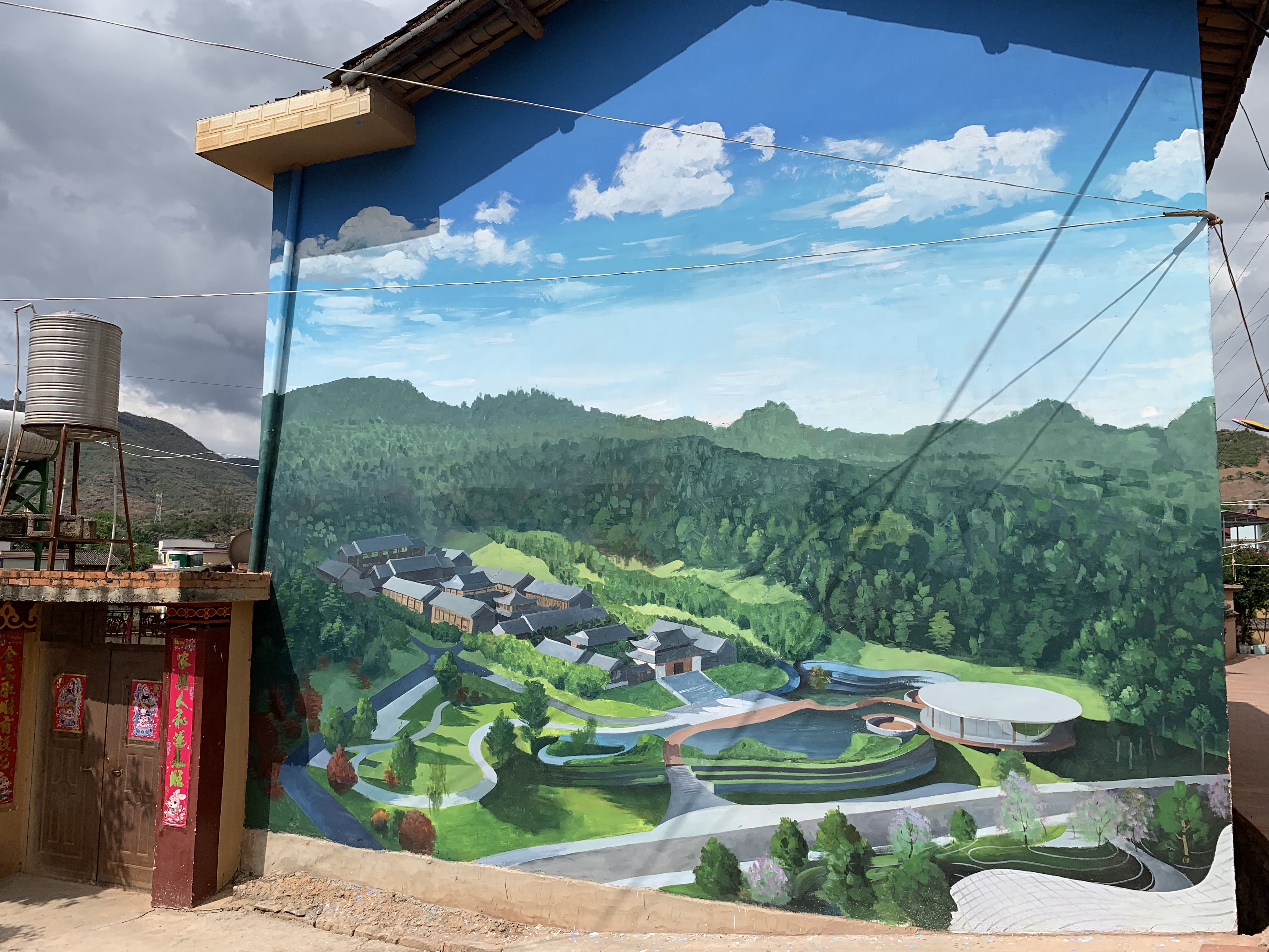6.显特色。通过召开村民代表会议,结合实用性村庄规划制定出侏罗纪新村建筑风貌、房屋层高,根据恐龙生活世纪年代土质颜色结合彝族民族特色,确定外立墙面以奶油黄色加彝族、恐龙元素,外立面改造16个点位24080.92㎡,墙体彩绘1400㎡。