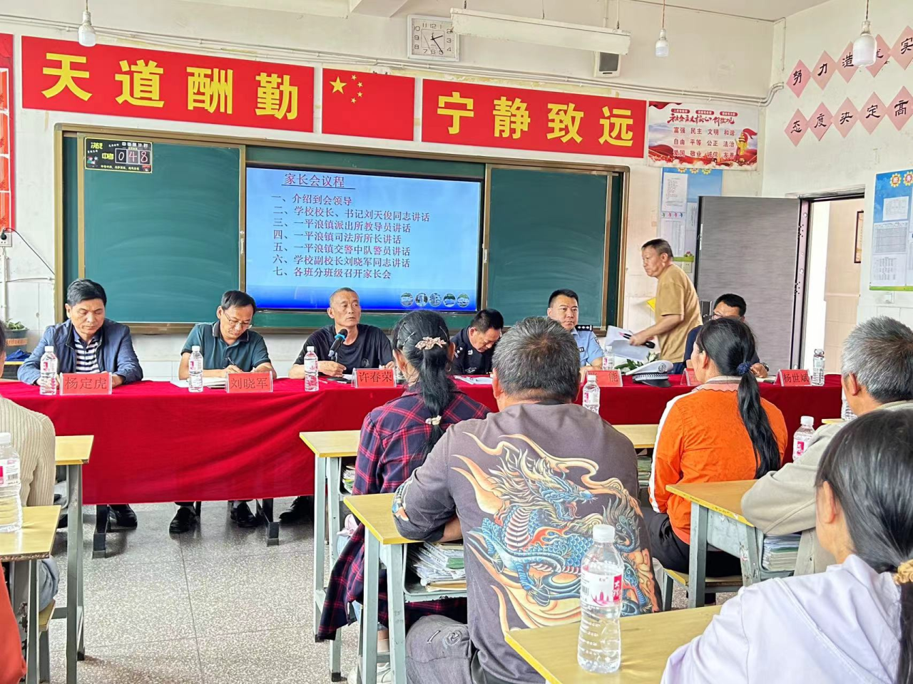 为认真贯彻落实禄丰市预防未成年人违法犯罪和未成年人保护暨校园安全的会议精神,近日,一平浪派出所、一平浪司法所、一平浪交警中队以一平浪中学开展2024年秋季学期家长会契机,深入学校开展普法进校园活动。本次活动围绕校园欺凌、控辍保学、道路交通安全、电信诈骗等开展普法宣传,学校设立主会场一个,分会场设腾讯视频会议室19个,共计600余名学生家长参加了活动。