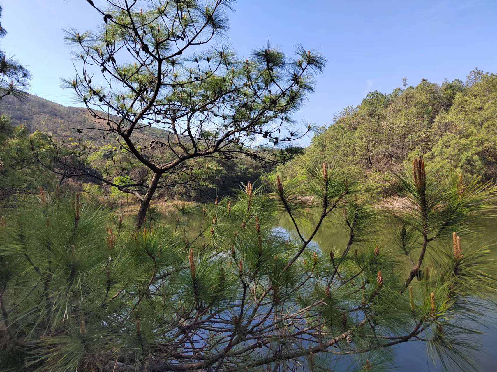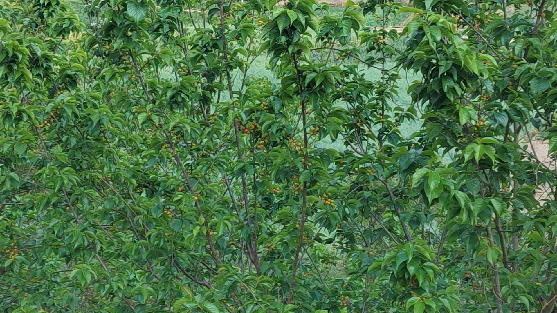 沿着入山道路前行,灌溉的水流从旁边缓缓流过,路两边的樱桃树结满了果实,在阳光下像是一颗颗熠熠生辉的红珍珠,因为早就“觊觎”这鲜美的果实,我们见证了它从开花到成熟的全过程:一个多月前还是漫山遍野的樱花,像一片片粉色的海洋,走近还能听到嗡嗡的蜜蜂声,勤劳的蜜蜂在花海之间穿梭采蜜,后来樱花蜕变成绿色的小果,直到如今变成一颗颗让人垂涎欲滴的果实。因为有水,路两边还能看到成片的蕨菜,它未展开的幼嫩叶芽是可以比肩香椿的一道美食,有的蕨菜正破土而出,探出小脑袋来准备凑凑这春天的热闹。各种野花竞相开放,树木伸展着绿芽,徜徉在这明媚的春光里,感受着万物生长的气息,疲意渐消。