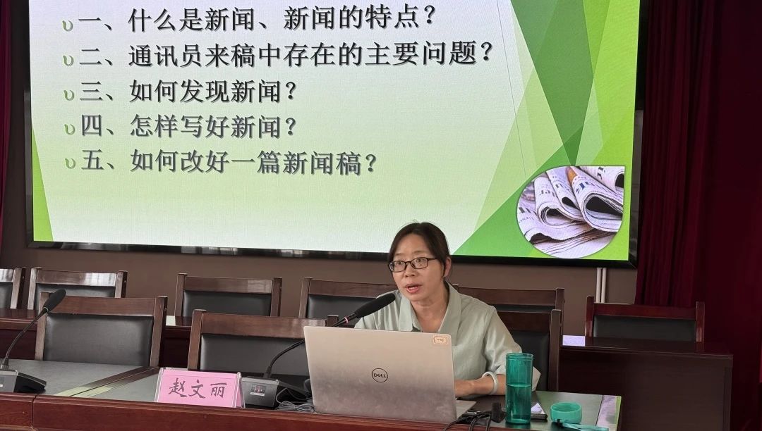 培训班上,赵文丽老师结合自身丰富的工作经验给大家作了新闻采访与写作培训,从什么是新闻、新闻的特点、通讯员来稿中存在的主要问题、如何发现新闻、写好新闻、如何改好一篇新闻稿五个方面给全体培训人员讲授了新闻写作实战技巧,并以自身多部新闻稿件作为实例分析,深入浅出地讲解了新闻基础知识、新闻信息的撰写技巧及语言表达方式,让每名学员在基层工作中挖掘、发现并写好新闻信息提供了有效帮助。同时,赵老师也从图片视频拍摄技巧作了经验分享,进一步提升基层干部获取新闻素材的敏锐度。