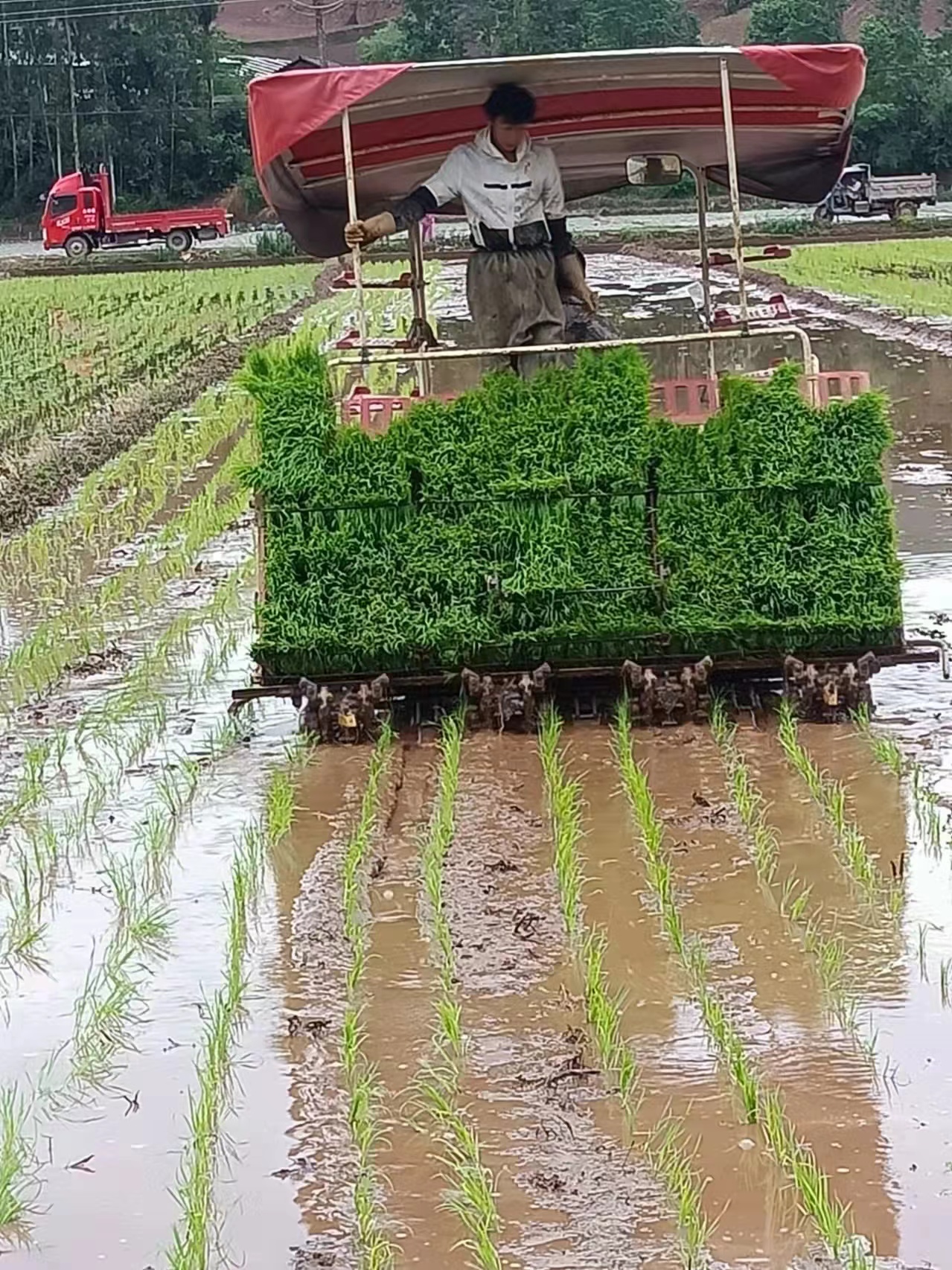 机器轰鸣,农机手熟练驾驶操作插秧机,一株株嫩绿的秧苗从插秧机秧盘上滑落,有序地被插入田里,一行行秧苗整齐排列,为稻田铺上了一层淡淡的新绿。水稻机械化种植不仅能提高作业效率,还可有效解决因缺乏劳动力导致粮食播种面积减少等问题。