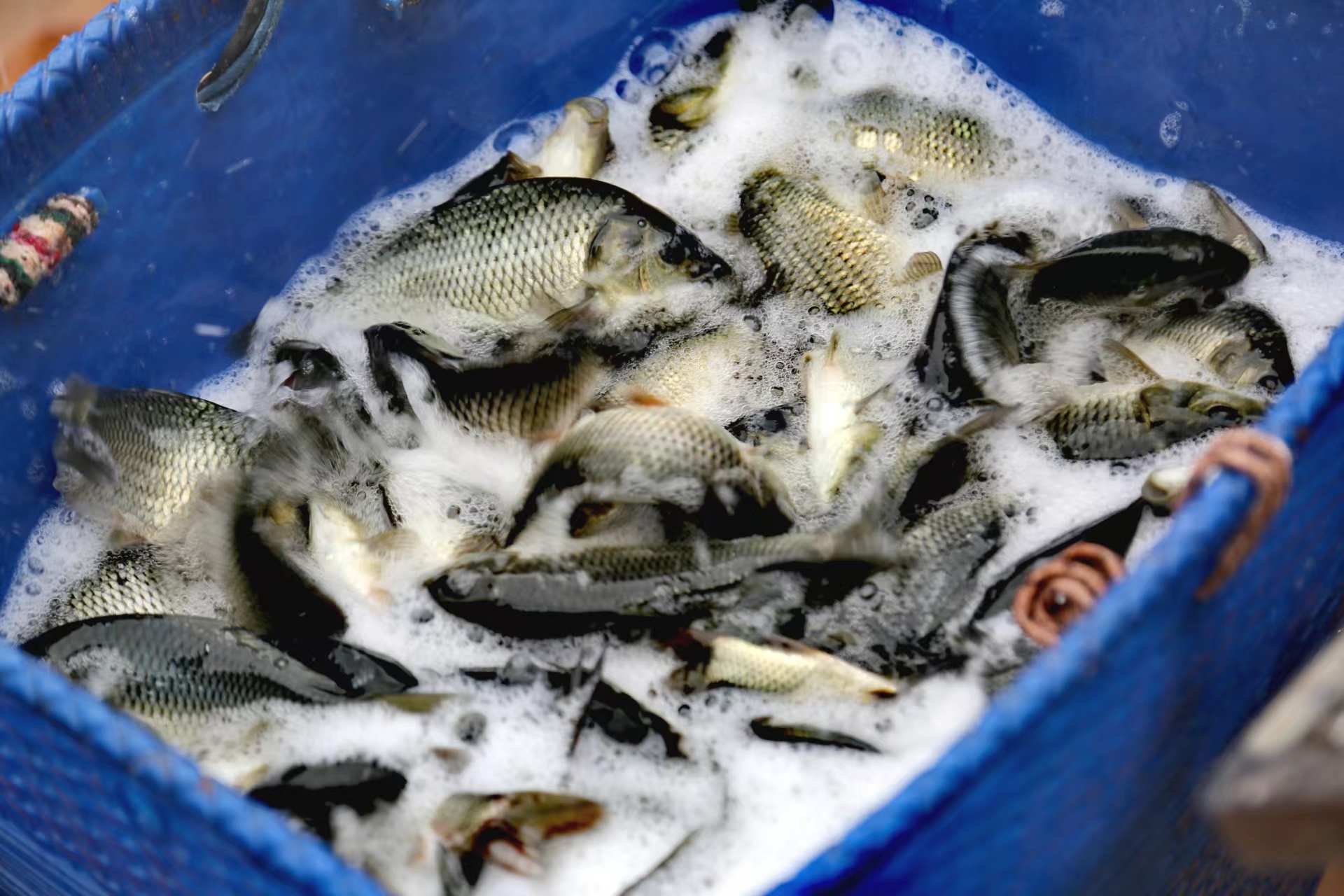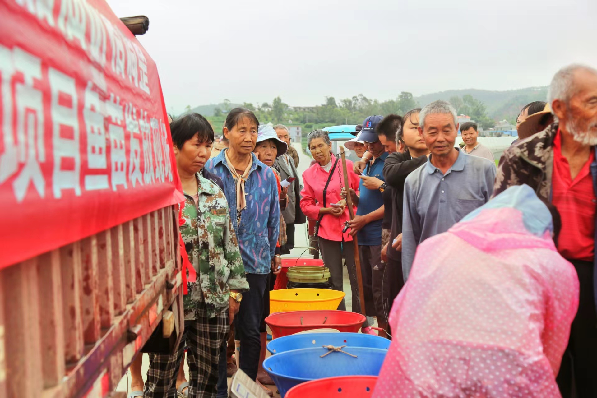 “大家不要着急,家家都有份。”“领到鱼苗的群众,要马上放到稻田里,这样鱼苗才活得好。”在金山镇科甲社区的丰收大道,村干部和农技人员正组织群众领取鱼苗。村民们提着桶、拿着盆,看着工作人员从运输车上捞取跳跃翻腾的鱼苗,脸上洋溢着笑容。