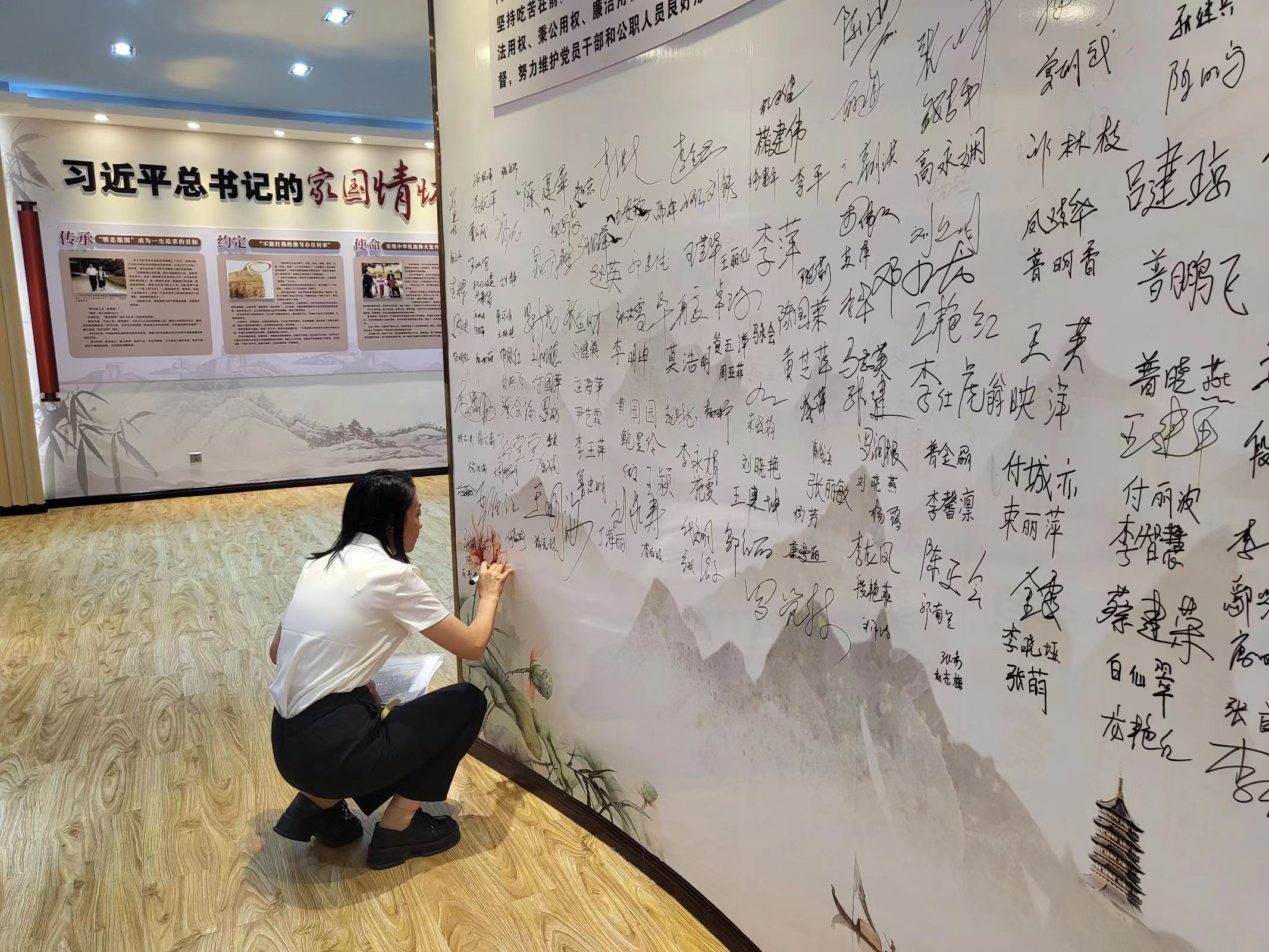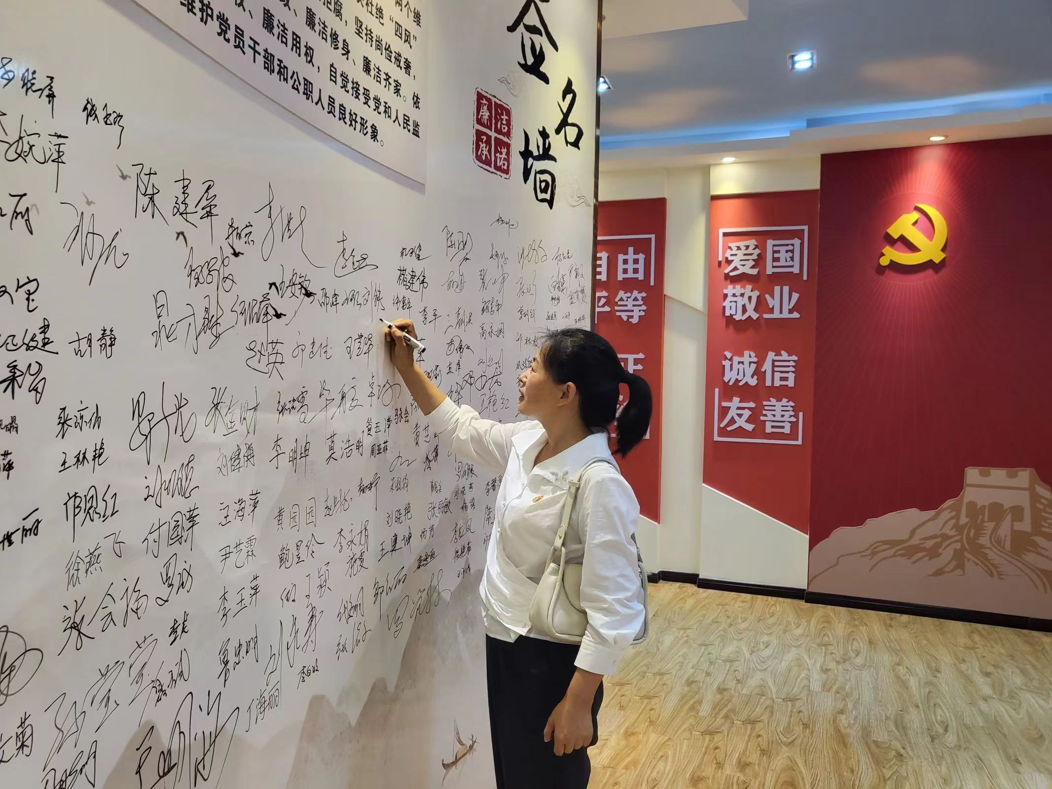 随后到达禄丰市新时代廉洁文化中心开展学习教育,在自动化讲解设备的引导下,全体人员先后参观了清风厅、正气厅,观看了典型案例和警示教育片。展览厅以文字、图片、影像等资料,系统展示了我国的廉政文化传统和全面从严治党的方针路线、近年来违反中央八项规定精神和违反六大纪律的典型案例、中国共产党建党、新中国成立辉煌成就以及禄丰市推进党风廉政建设和反腐败工作的成效与亮点。一幅幅发人深省的图片、一个个鲜活的案例、一句句发自肺腑的忏悔,从视觉、听觉、感觉等全方位、多角度冲击着每个人的心灵,激发大家深刻反思和警醒,起到了良好的警示教育效果。最后,大家在廉洁承诺墙上郑重地签上自己的名字,时刻警醒、鞭策自己。