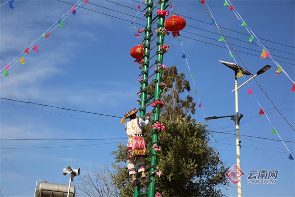 有着上百年历史的傈僳族传统绝技表演“上刀山,下火海”,把整个阔时节活动推向了高潮。白天,赤足的傈僳族青年,踩着由36把锋利钢刀搭成的12米高的刀杆,一路攀向顶端,祈求来年风调雨顺、五谷丰登、四季平安。晚上,楚雄州非物质文化遗产项目代表性传承人张兴明,带领勇敢的傈僳族青年,表演了“下火海”民间绝技。