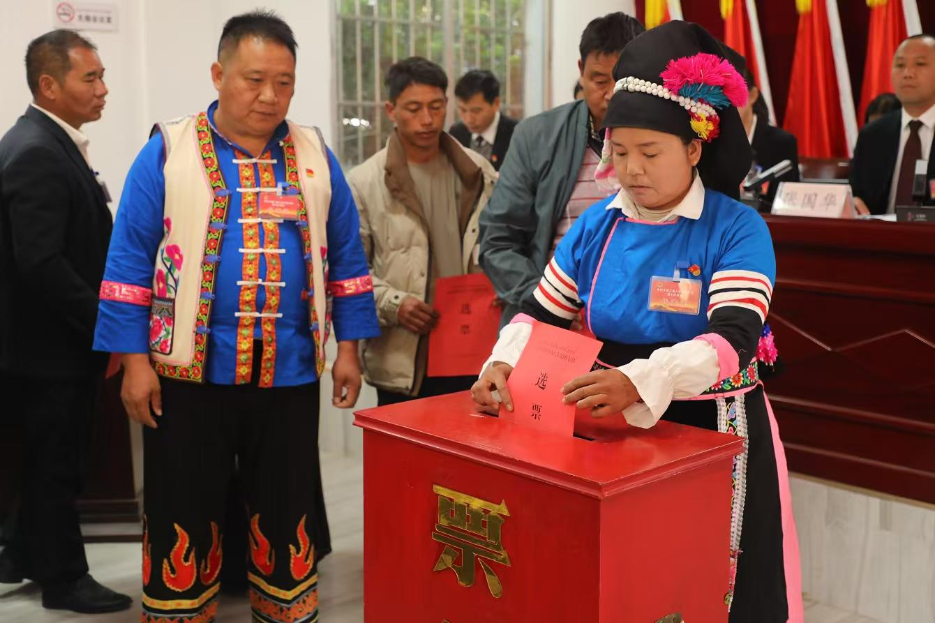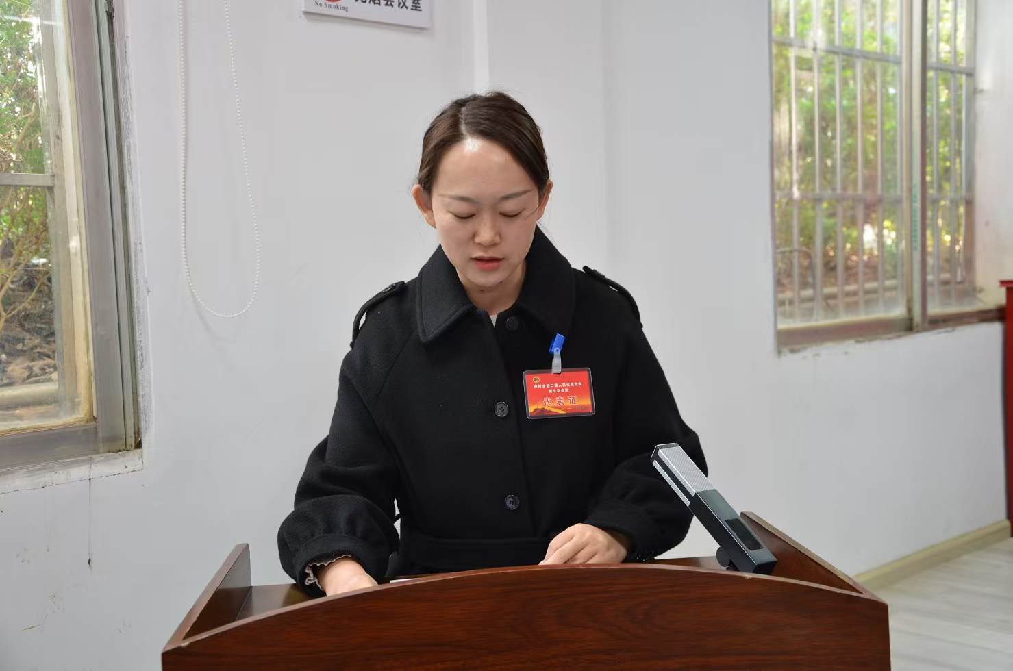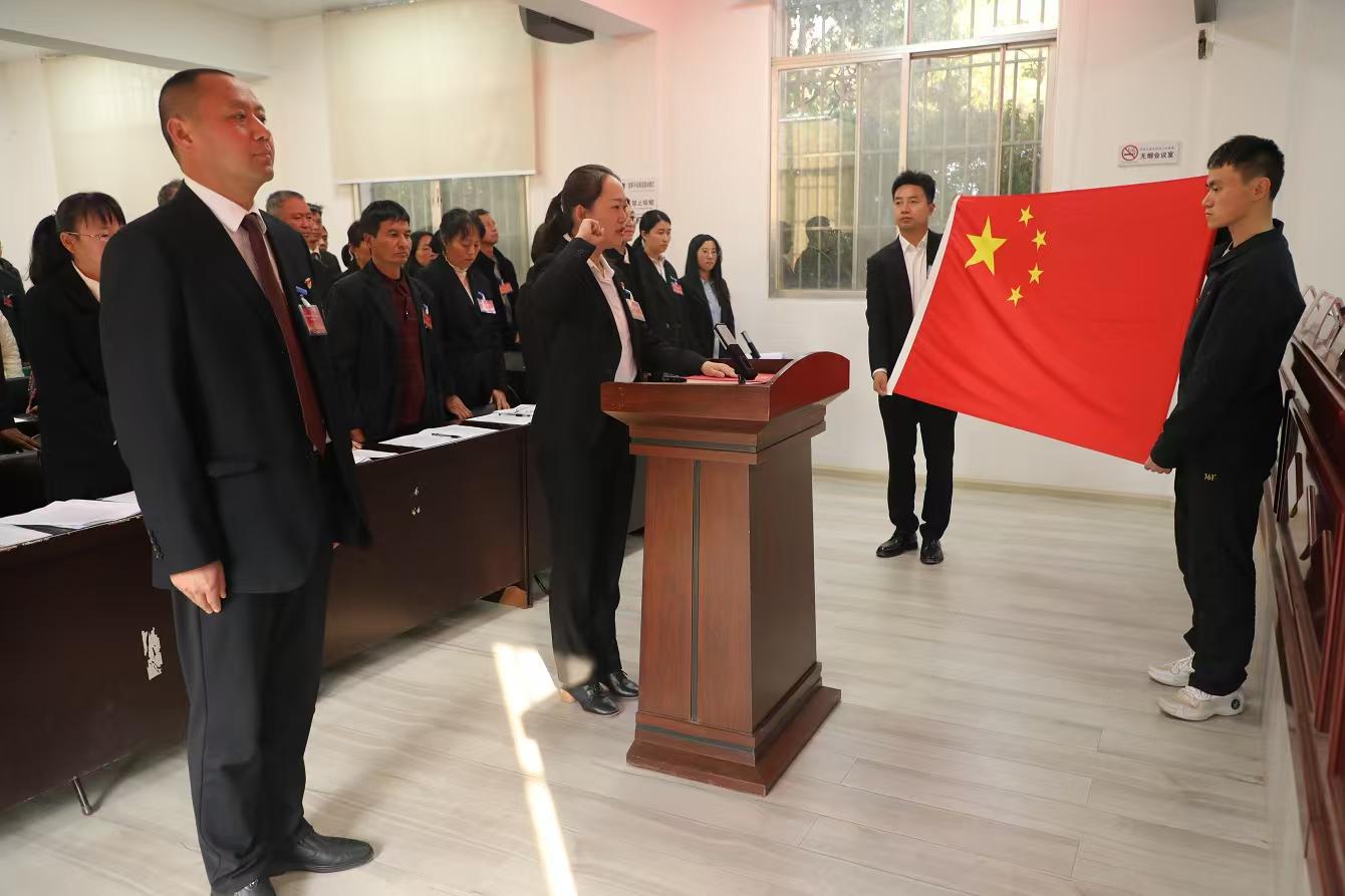 在第二次全体会议上,尹碧丽同志当选为中村乡人大主席团主席,乡党委书记张国华为其颁发当选证书,新当选的乡人大主席团主席尹碧丽同志向宪法宣誓。