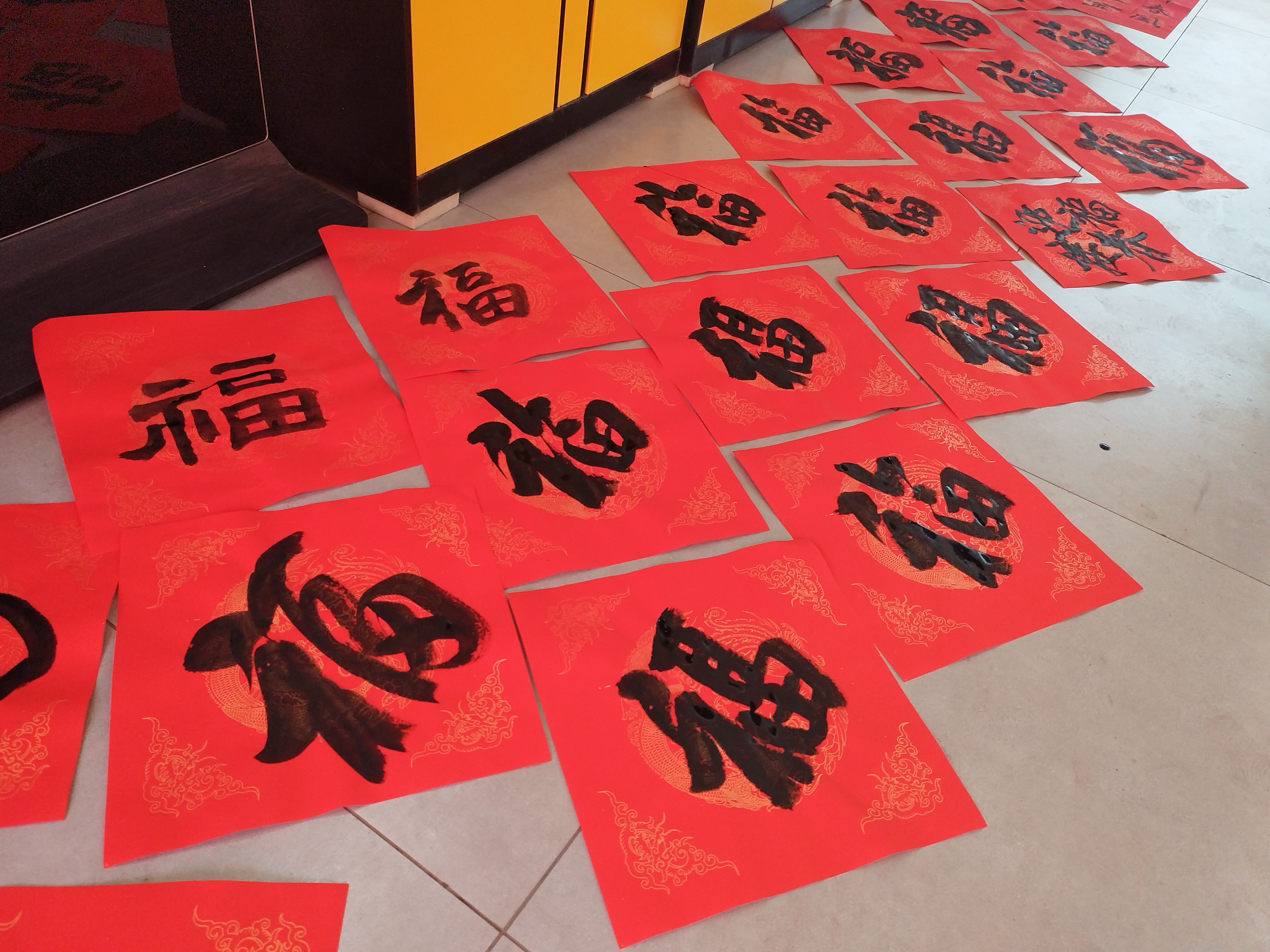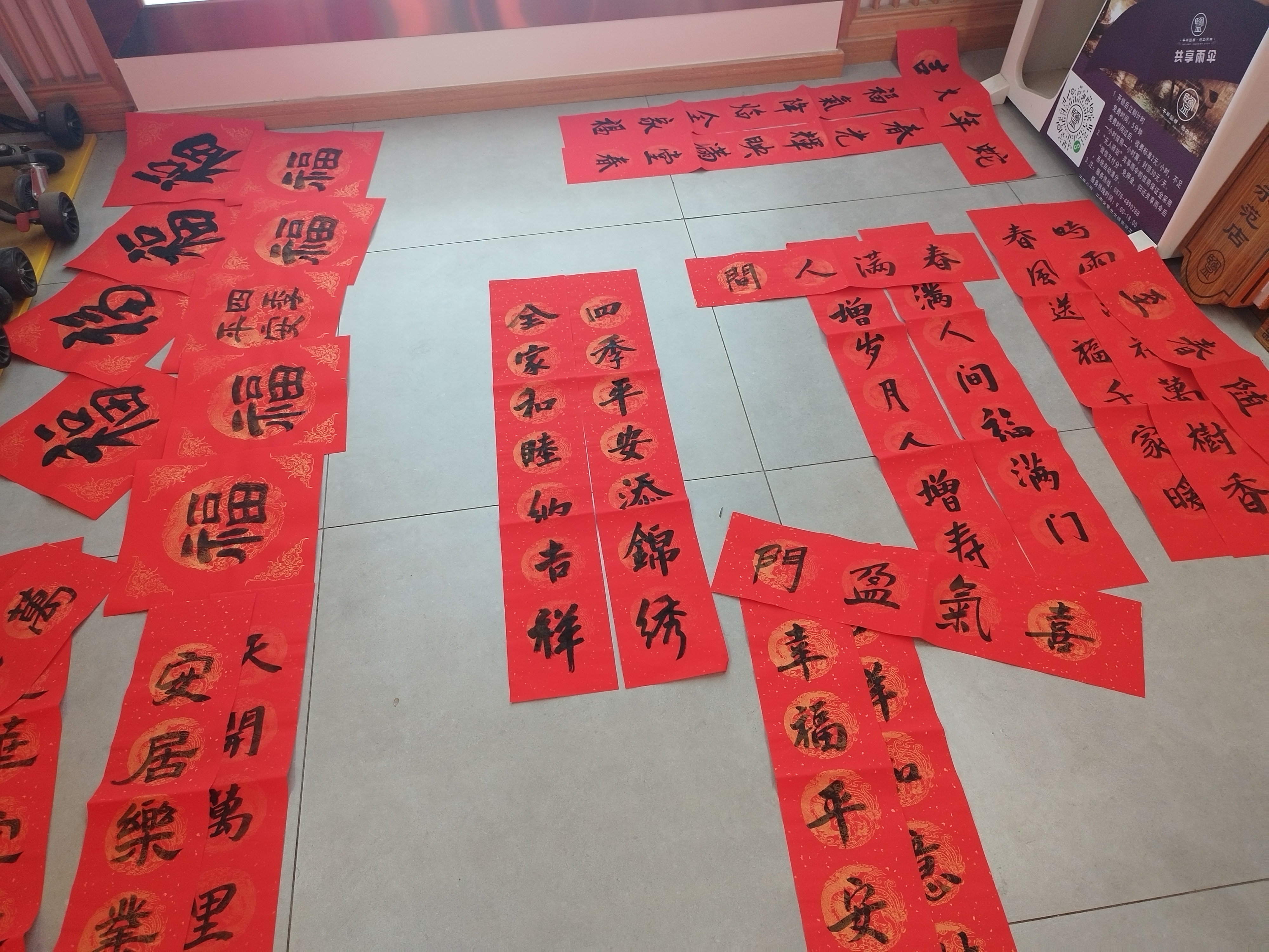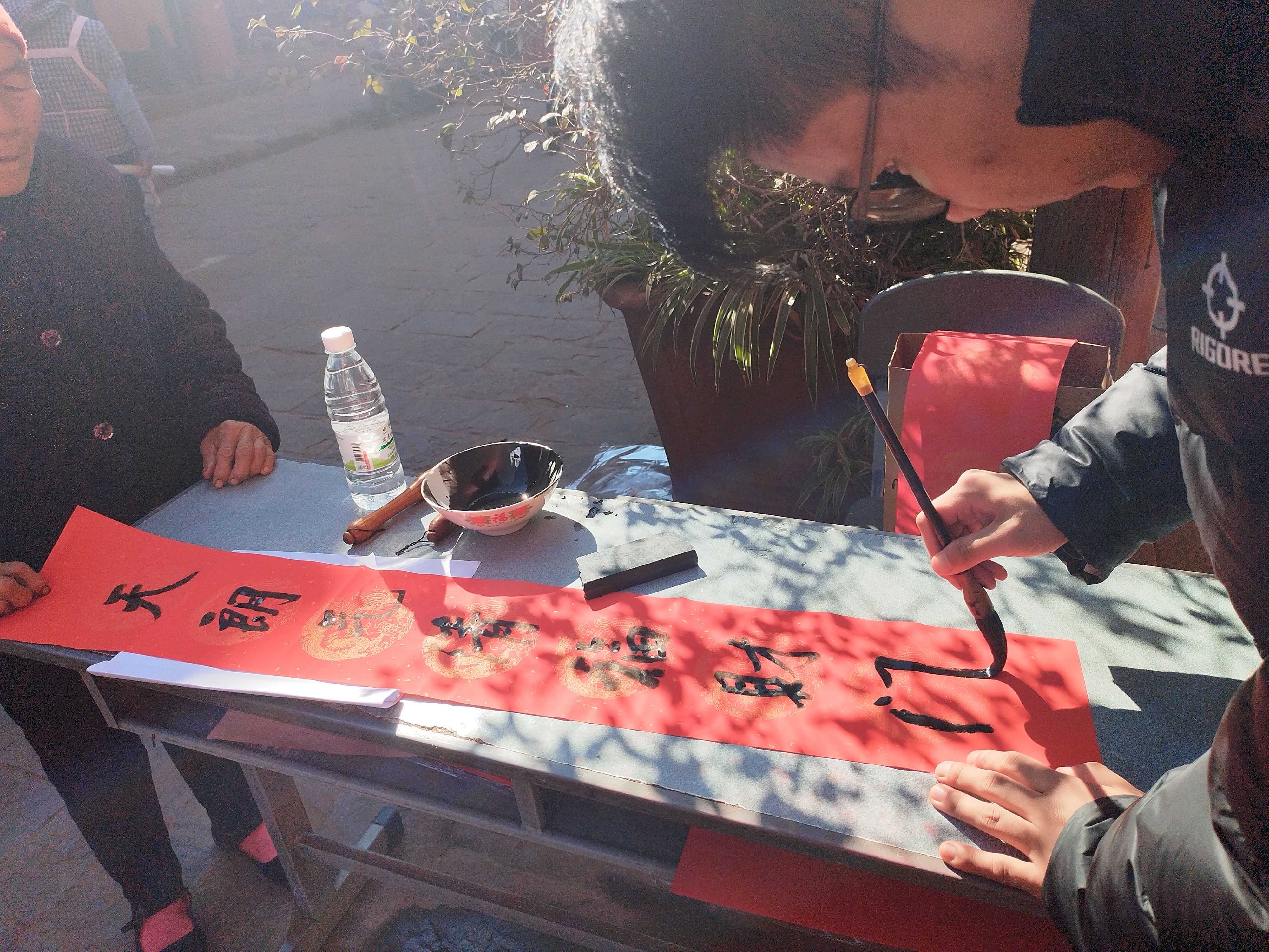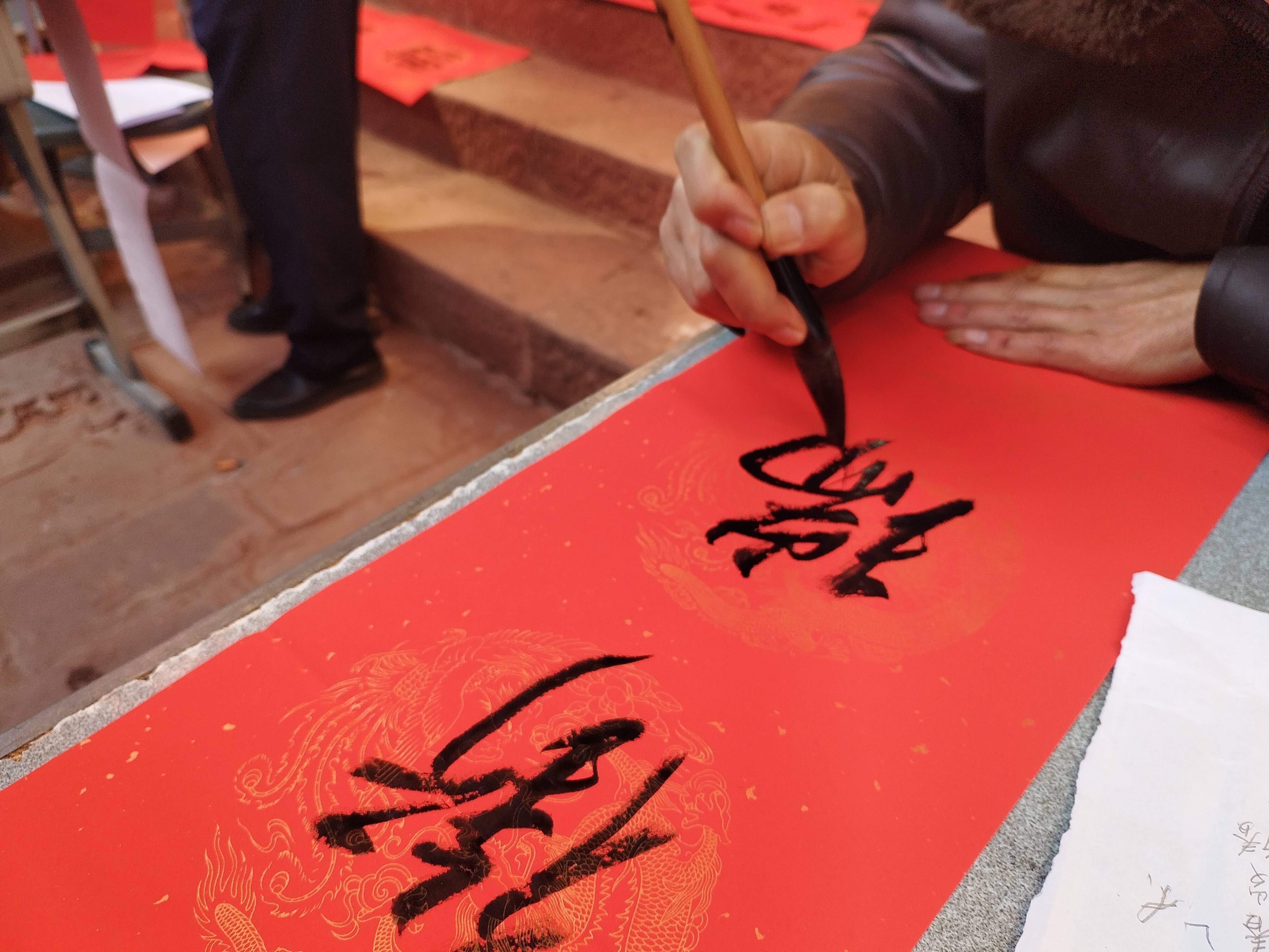活动现场气氛热烈,来往群众络绎不绝。一张张红色的宣纸整齐的铺陈在桌面,几位老师全神贯注,落笔宛若游龙,一个个象征吉祥的“福”字、一对对饱含祝福的对联跃然诞生在笔尖,一笔一墨、一横一竖都蕴含着对新春的美好祝愿。来领春联的人们有序围绕在书桌周围,不时请老师写下自己心仪的春联内容,人群中时而传出阵阵赞叹,一张张幸福洋溢的笑脸与火红的春联交织成了一幅独特的年画。
