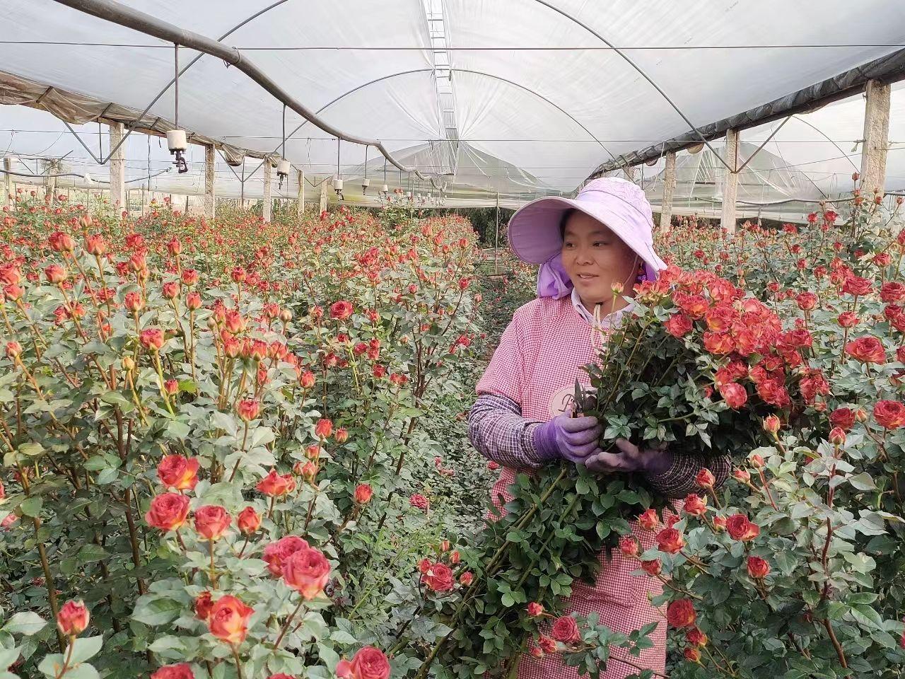 在恐龙山镇法门村委会小村大杨花卉种植基地,韩存洪也在自家的玫瑰鲜切花种植大棚里忙碌着。五年前,他看中了恐龙山镇优越的自然条件,把一直在老家晋宁的花卉种植产业延伸到了这里,经过多年发展,基地在斗南花市成立了花卉直销中心,种植面积从起步的26亩扩大到了100余亩,年产玫瑰鲜切花300多万枝,平均每天产量8000多枝。今年新增种植的朱丽叶塔、巧克力泡泡、卡布奇诺、苏菲宝贝、折射泡泡等玫瑰花品种,因品质高、花期长,销售十分火爆,平均每枝售价2元至7元,使当地务工群众每天人均收入90元以上。