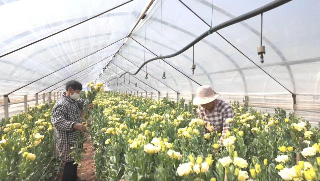 近日,恐龙山镇鲜切花种植基地呈现产销两旺的局面,大棚里洋桔梗、满天星、多彩玫瑰迎春绽放,花香宜人,工人们正忙着采摘、修枝、包装、发货。