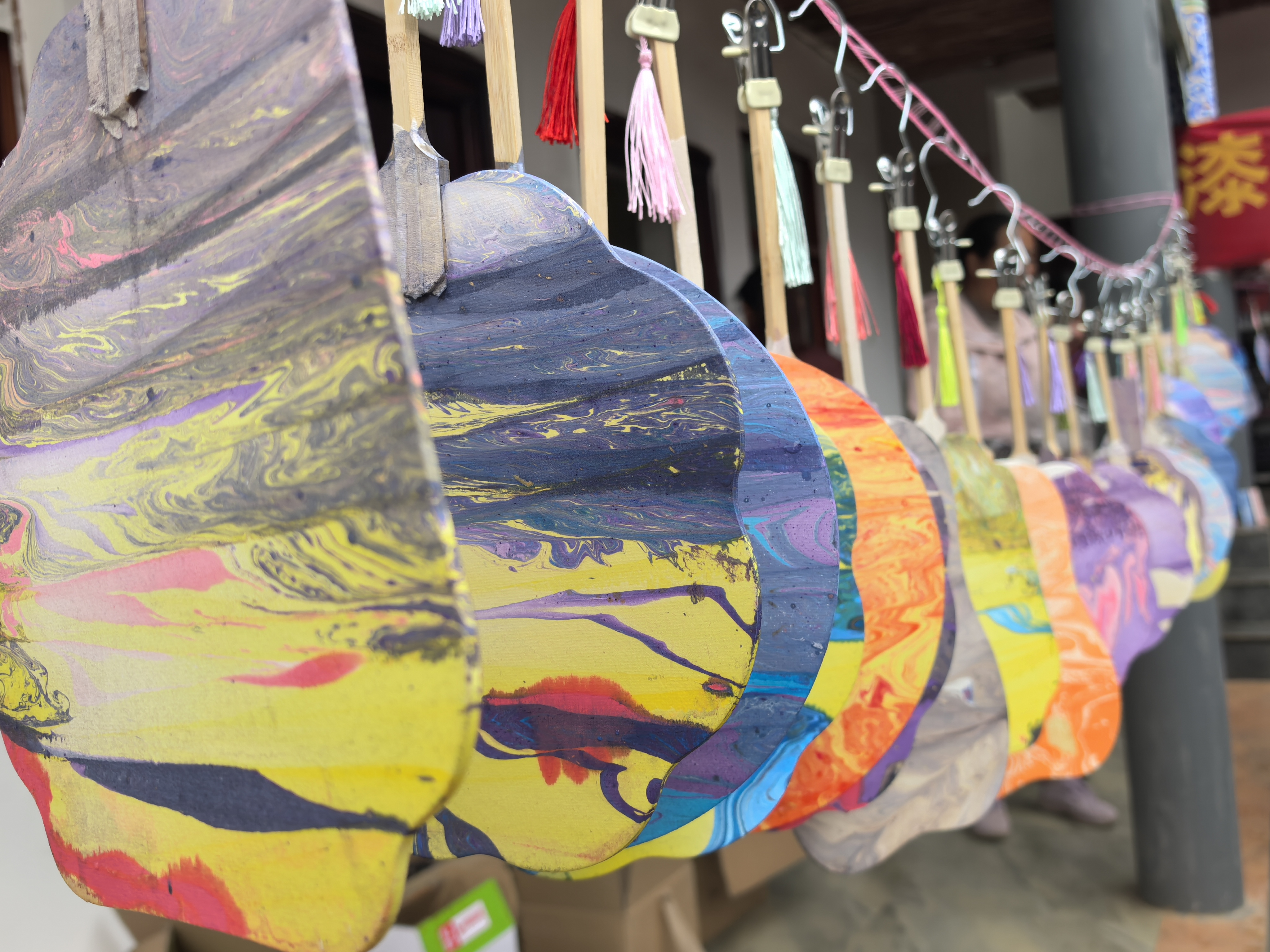 以“漆”为笔,用“扇”作画,一半人为,一半天成。大家踊跃制作漆扇,根据自己喜好搭配颜色并染制出一把把色彩绚丽、精美独特的漆扇成品。
