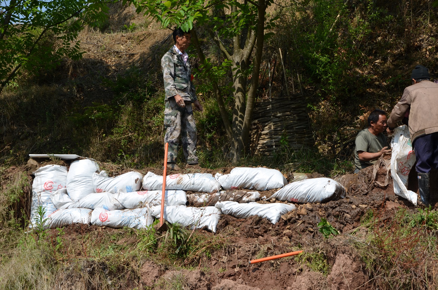 通过一个上午的突击抢修,共用沙包堆筑沟埂3处,总长15米,铺塑料薄膜80余米。“马上就要栽秧、栽烟了,河脑大沟坍塌严重,今天村委会通知我们来抢修,保证以后春耕生产用水畅通无阻。”茅草房村小组村民黄先富说。