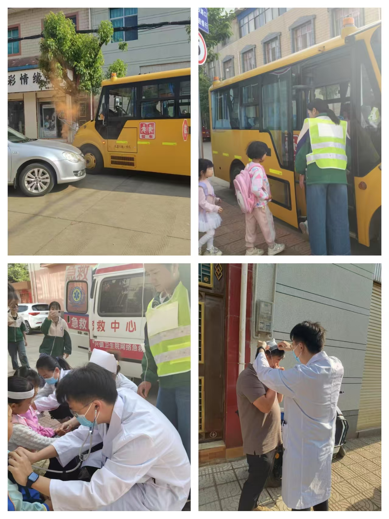 上午9:00,演练正式开始。校车停靠在学校门口,跟车教师和老师指挥10名学生按往常一样排队上车,跟车教师在车上清点人数,提醒并检查幼儿的安全带是否规范系好,驾驶员检查车辆状况良好后上车关门,安全启动车辆。演练模拟校车驶离学校西面约50米“T”字型路口处时,与对向行驶的一辆小轿车发生碰撞,造成校车上3名幼儿受伤,其中一名幼儿头部受伤,伤势较为“严重”,小轿车司机头部受伤,小轿车引擎冒烟,两车不同程度受损。