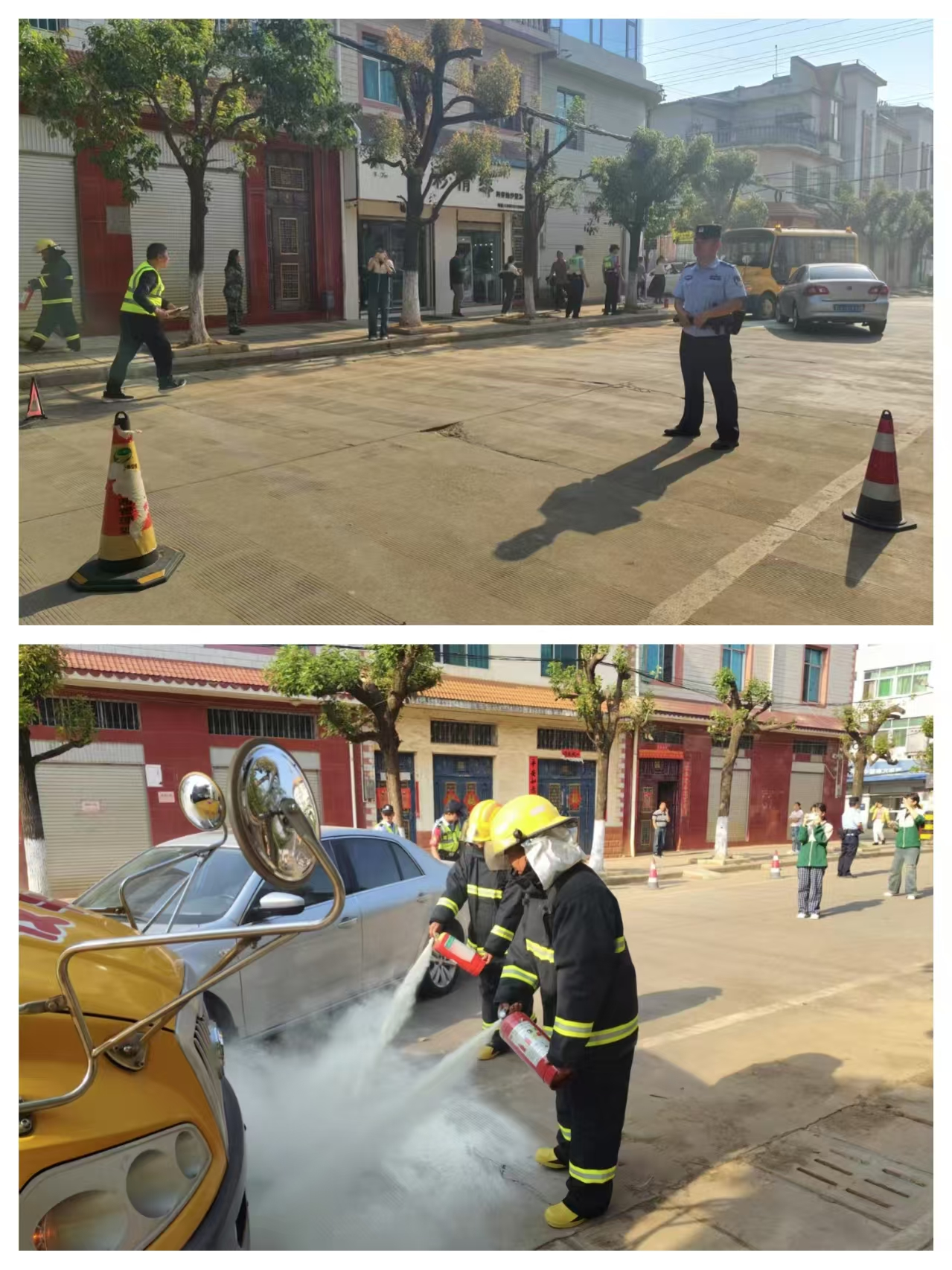 随后,各演练小组依次进入现场。禄丰市公安局交警大队二中队民警首先到达现场后,道路安保小组在事发地点车辆前后各50米处,设置交通警示,指挥车辆安全通行,对事故现场进行勘察调度;仁兴镇综合行政执法队消防应急救援人员赶到现场后,立即对冒烟车辆进行二次灭火救援;仁兴镇卫生院现场救护小组对受伤的学生及时进行紧急处置后,送往就近医院治疗;仁兴派出所现场疏导及舆情管控小组及时利用锥桶、警戒线隔离现场,疏导人群撤离至安全地带,劝导周围群众不要聚集,信息上报小组第一时间上报事故情况并及时组织人员到达事故现场;仁兴镇小学校长、仁兴镇人民政府等主要领导也赶到现场参与救治和处理善后工作。家属接待小组告知学生家长学生的伤情情况,做好学生家长安抚工作;后勤保障小组完成事故后续处置工作。