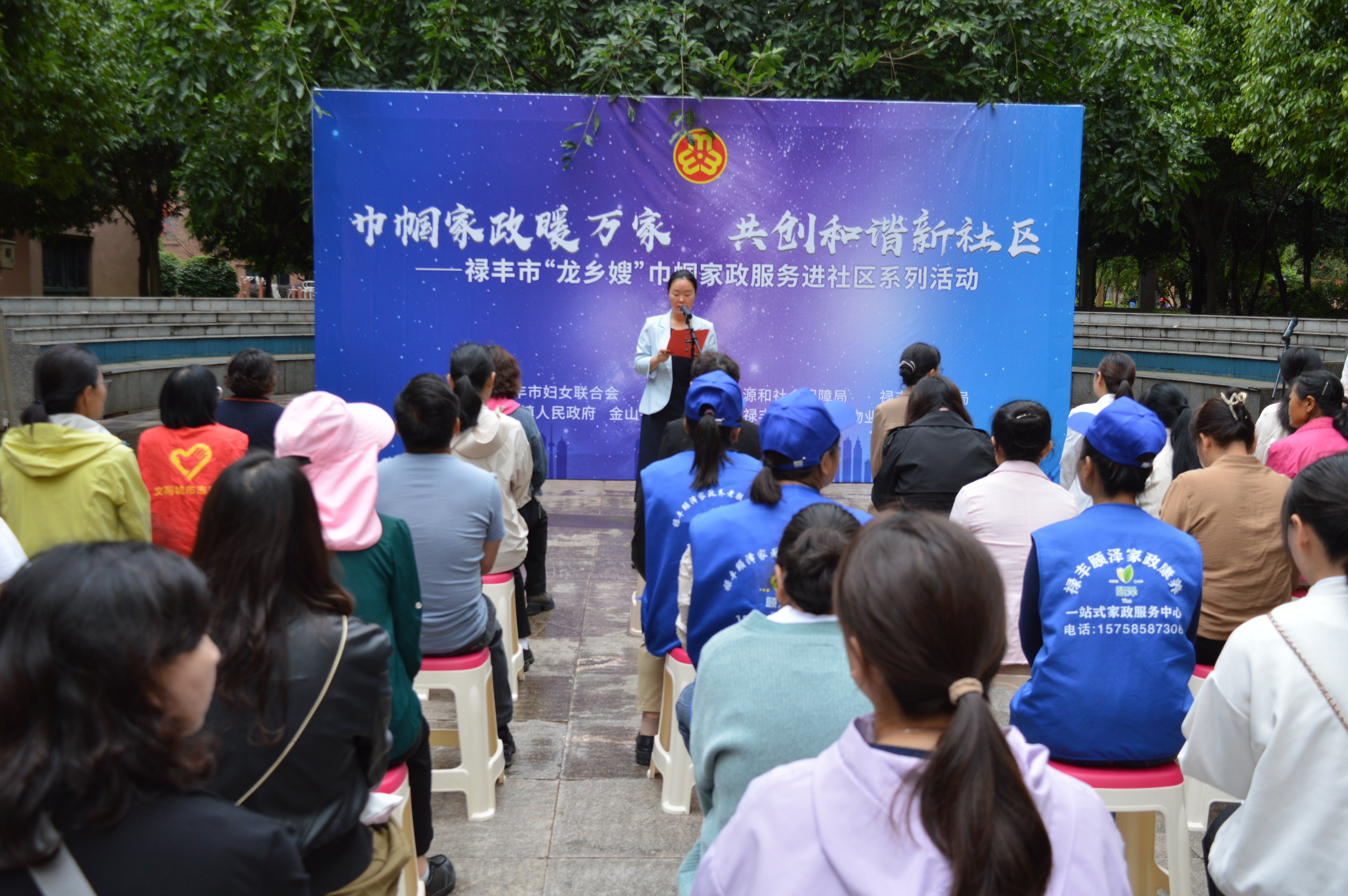 在活动开始前,开展了家政服务队授旗仪式。市委常委、市委统战部部长崔亚兰和市妇联、市社工部领导对云南颐泽家政服务有限责任公司、国控创服医疗技术(云南)有限公司、禄丰市玉萍家政服务有限公司、禄丰市家净源高端家政服务有限公司、禄丰市洁丽安家政服务部)家政服务队授旗。