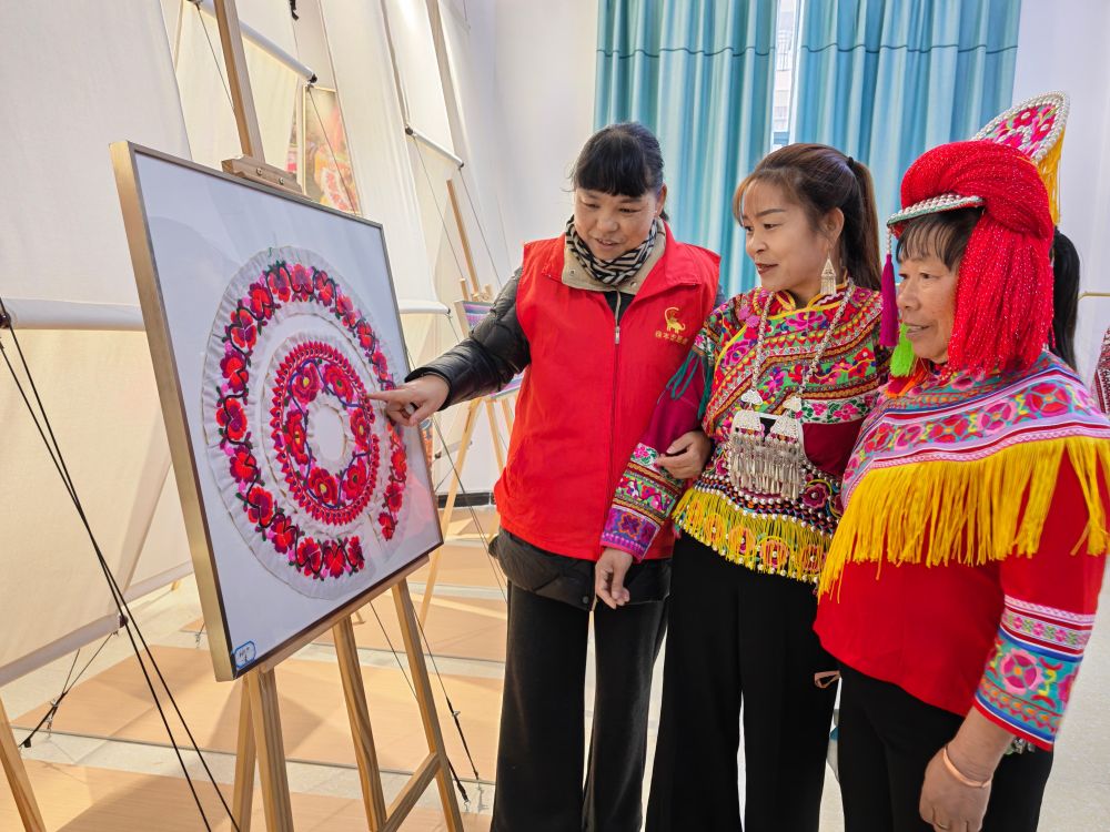 图为:搬迁群众在思源社区彝绣工坊学习绣样