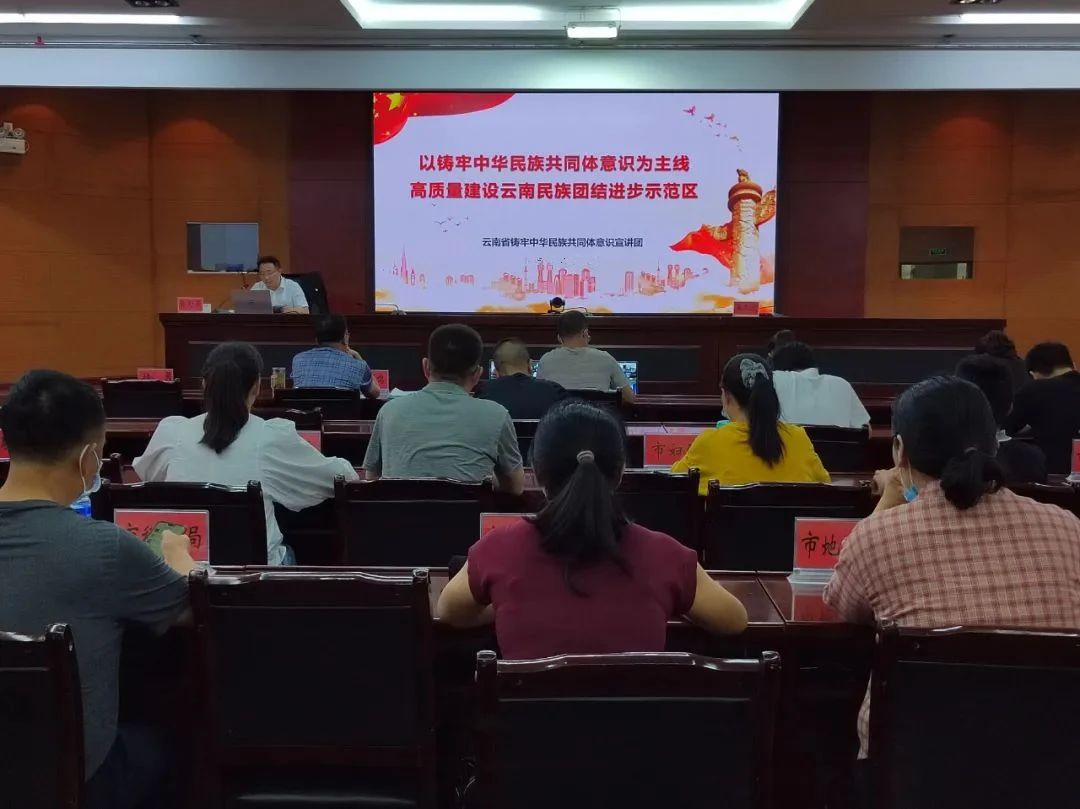 抓好教育培训。把学习习近平总书记关于加强和改进民族工作的重要思想作为重大政治任务,把铸牢中华民族共同体意识列入市委理论学习中心组、全市党员干部教育及“万名党员进党校”等学习培训重要内容,把党的民族理论政策法规作为各级党委(党组)、中心组理论学习、党校各类培训必修课,邀请“云岭大讲堂·楚雄讲坛”宣讲团为全市讲授专题讲座3场次;依托全市“万名党员进党校”平台、“干在实处、走在前列”大比拼“课堂”,市委宣讲团到各乡(镇)、市级各部门开展专题讲座。目前,全市共举办各级各类党员干部培训班20期1.7万人次,党的民族理论、民族政策培训全覆盖,党员干部对民族政策法规和民族知识知晓率达95%以上。