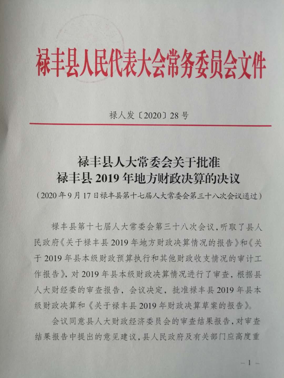 禄丰县第十七届人大常委会第三十八次会议,听取了县人民政府《关于禄丰县2019年地方财政决算情况的报告》和《关于2019年县本级财政预算执行和其他财政收支情况的审计工作报告》,对2019年县本级财政决算情况进行了审查,根据县人大财经委的审查报告,会议决定,批准禄丰县2019年县本级财政决算和《关于禄丰县2019年财政决算草案的报告》。