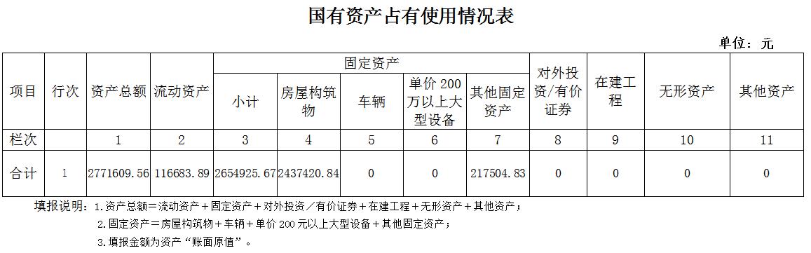 截至2021年12月31日,禄丰市樟木箐州级自然保护区管护局资产总额2771609.56元,其中,流动资产116683.89元,固定资产2654925.67元,对外投资及有价证券0元,在建工程0元,无形资产0元,其他资产0元(具体内容详见附表)。与上年相比,本年资产总额增加802313.72元,其中固定资产增加765169.76元。新增房屋建筑物320平方米,账面原值765169.76元;处置房屋建筑物0平方米,账面原值0元;处置车辆0辆,账面原值0元;报废报损资产0项,账面原值0元,实现资产处置收入0元;出租房屋0平方米,账面原值0元,实现资产使用收入0元。