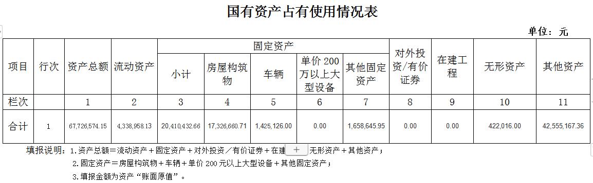 截至2021年12月31日,楚雄州禄丰市广通镇部门资产总额67,726,574.15元,其中,流动资产4,338,958.13元,固定资产原值20,410,432.66元,对外投资及有价证券0元,在建工程0元,无形资产原值422,016.00元,其他资产42,555,167.36元(公共基础设施-农村公路)。与上年相比,本年资产总额增加35,869,409.77元,其中:1、固定资产增加352,800.00元,2、公共基础设施-农村公路增加42,555,167.36元,3、货币资金减少14,370,000.00元,主要是2021年度以前没有将上划限额管理银行存款单独记账处置房屋建筑物0平方米,账面原值0元;处置车辆0辆,账面原值0元;报废报损资产0项,账面原值0元,实现资产处置收入0元;出租房屋0平方米,账面原值0元,实现资产使用收入0元。
